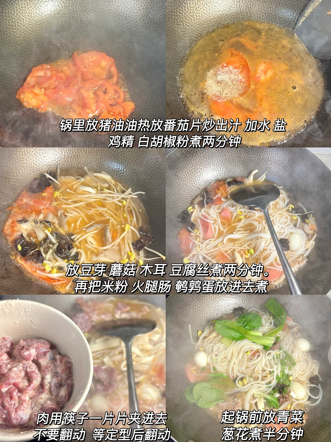 1️⃣:锅里放猪油 化开后放番茄片炒出汁,加足量的水,一小勺盐 鸡精 白胡椒粉 一甩蚝油 煮两分钟。放木耳 平菇 豆芽 豆腐丝煮两分钟,再放米粉 火腿片 鹌鹑蛋继续煮一会