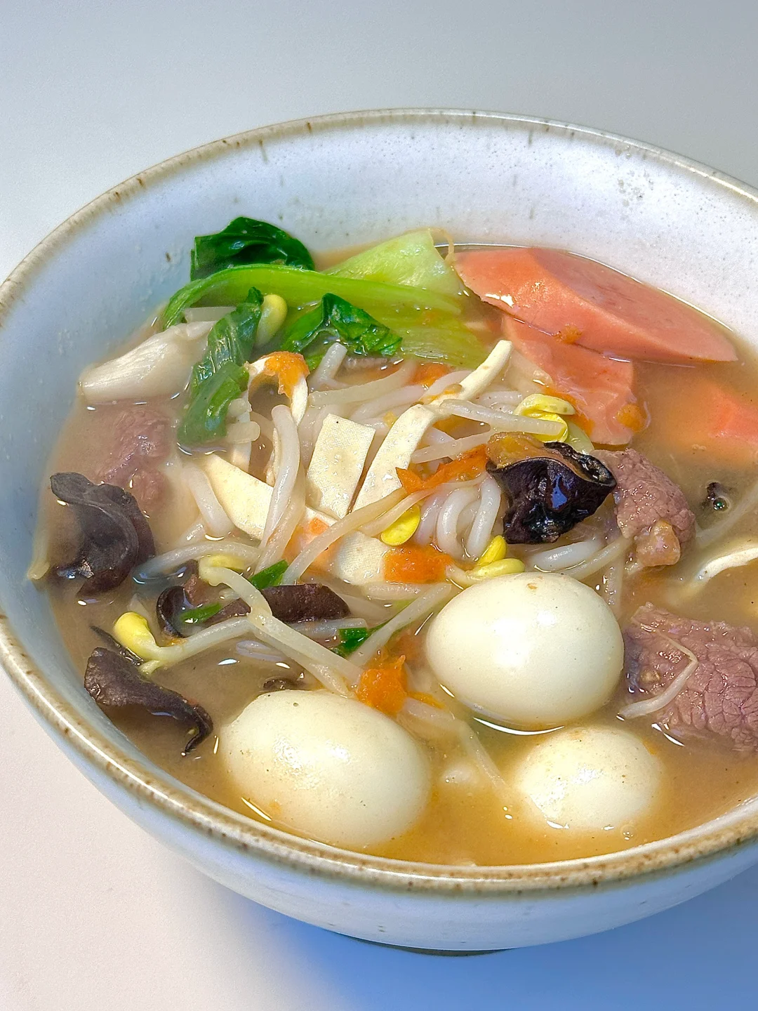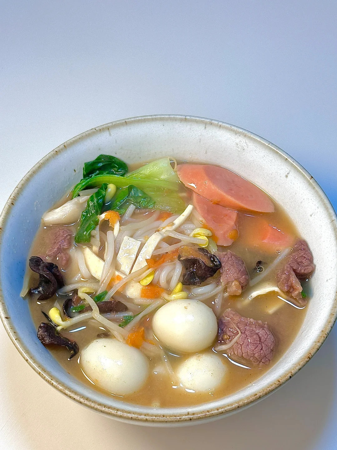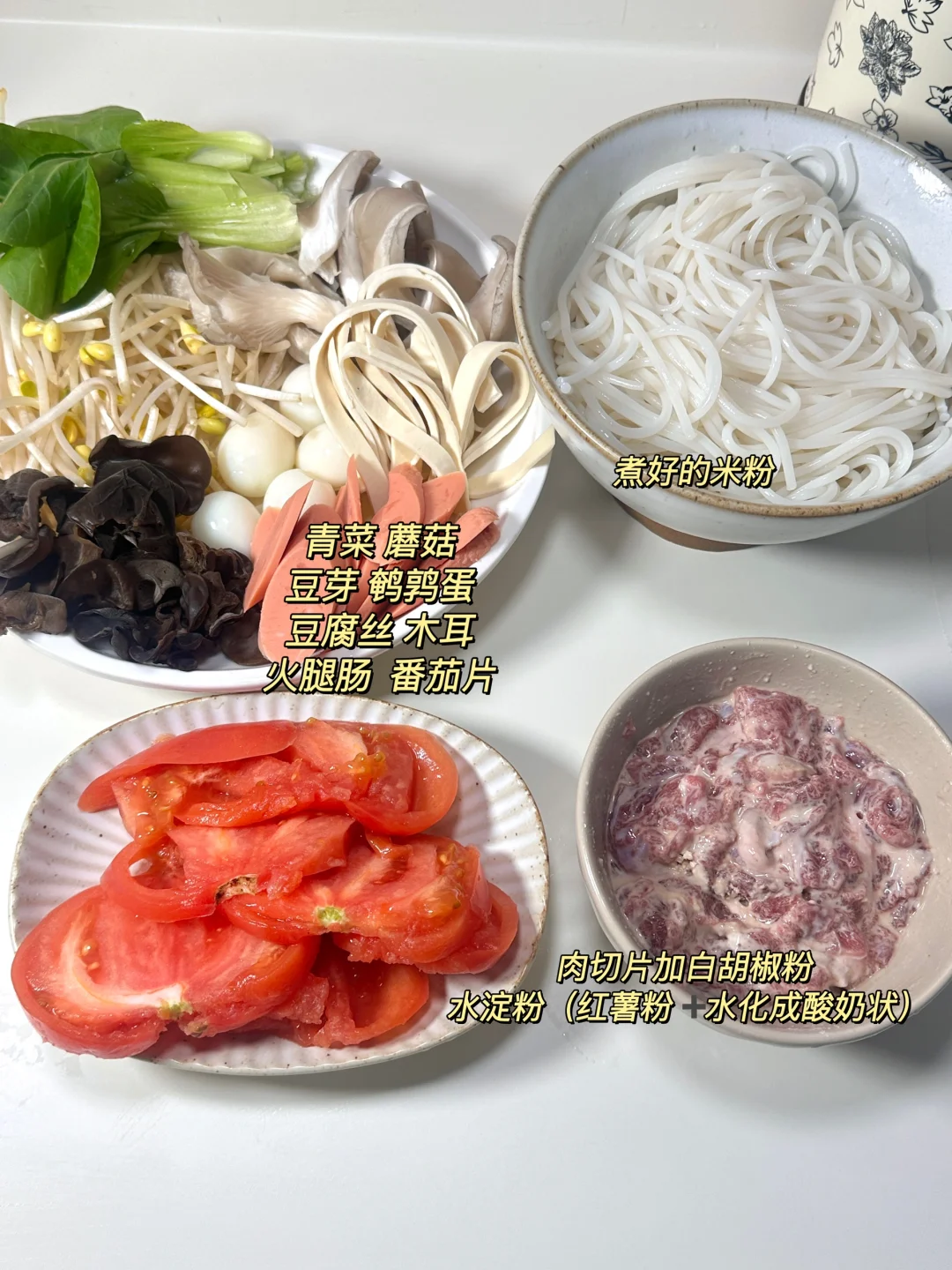 ✨食材:米粉 青菜 黄豆芽 番茄 鹌鹑蛋 木耳 火腿肠 豆腐丝 平菇 牛肉