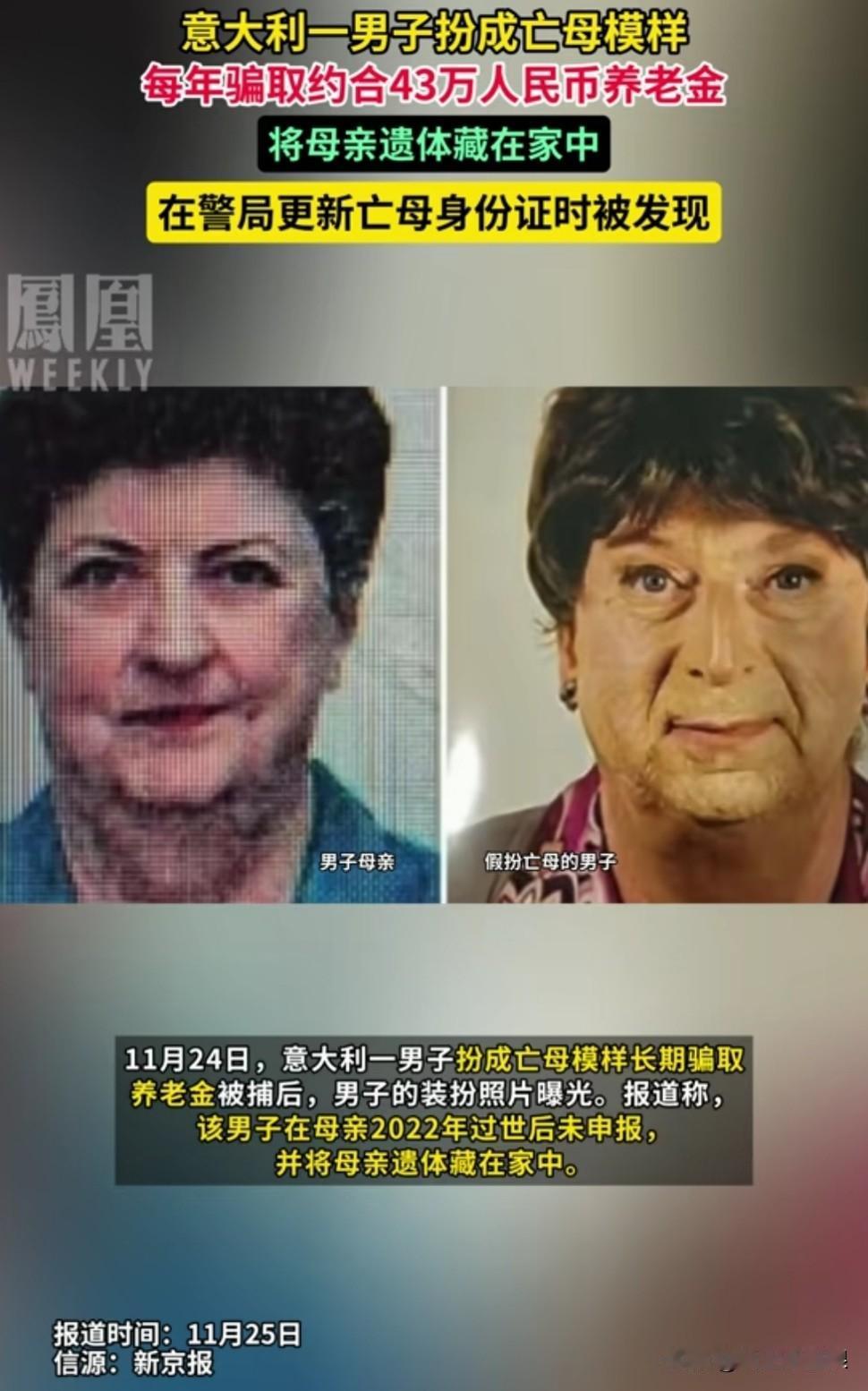 意大利一男子在母亲去世后,为了能够领取母亲的养老金,假扮成母亲去领取,每年大概能领取43万人民币。 不止意大利,日本也有很多这种人,为了父辈的养老金,一直瞒报,这也是为什么日本有那么多长寿者的原因,大家都不报,只要不查,那你就是万年老妖。
