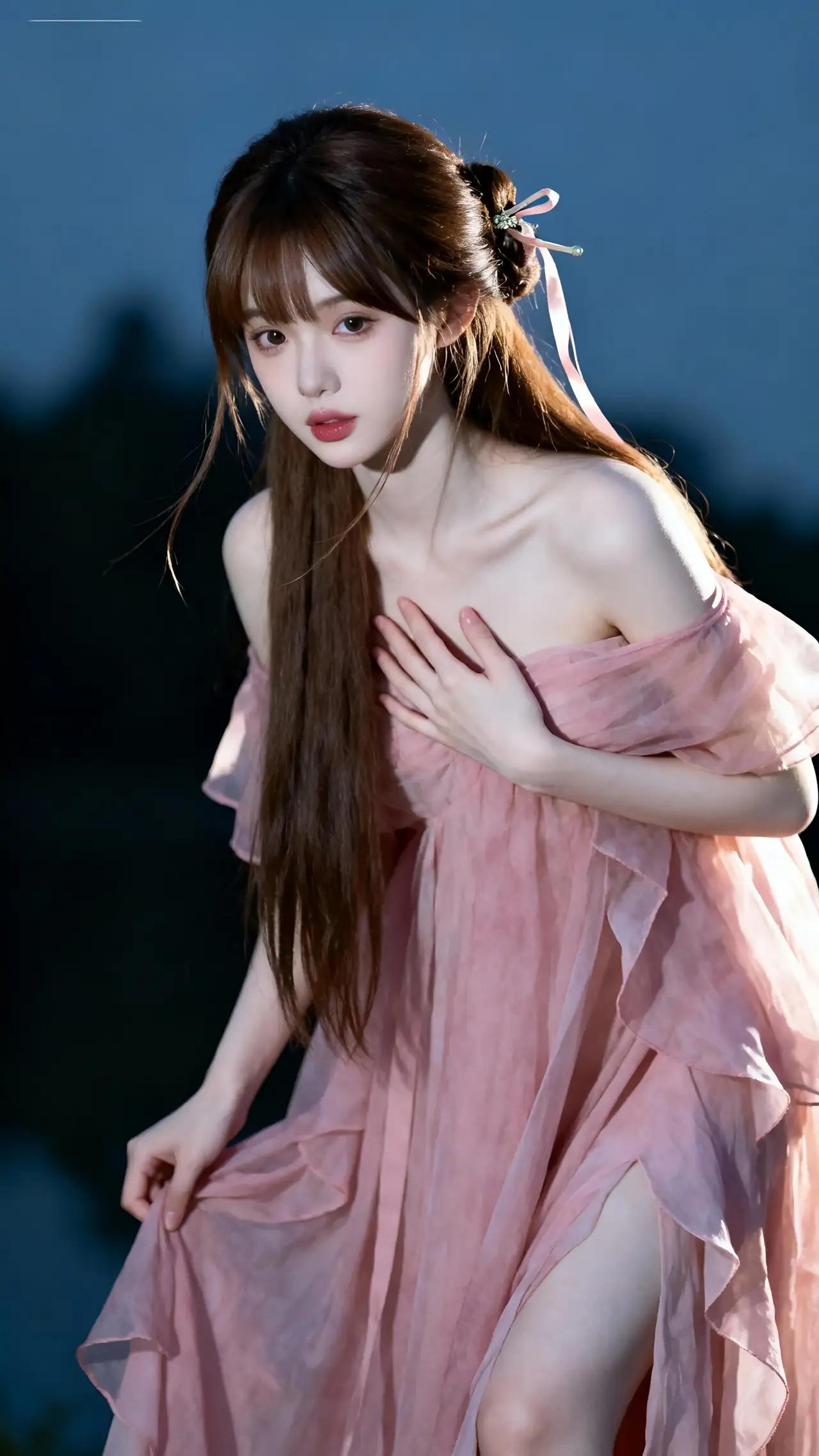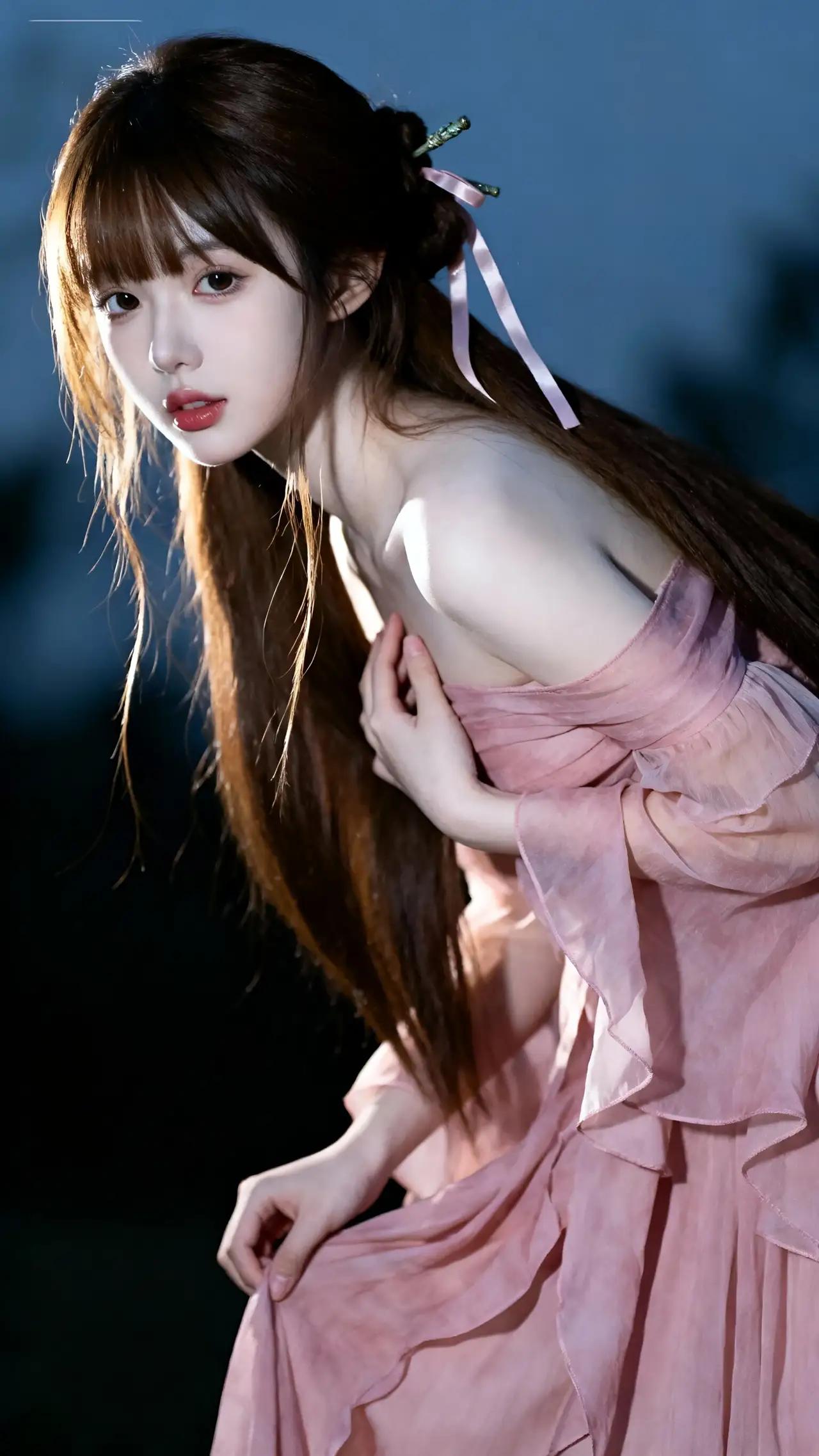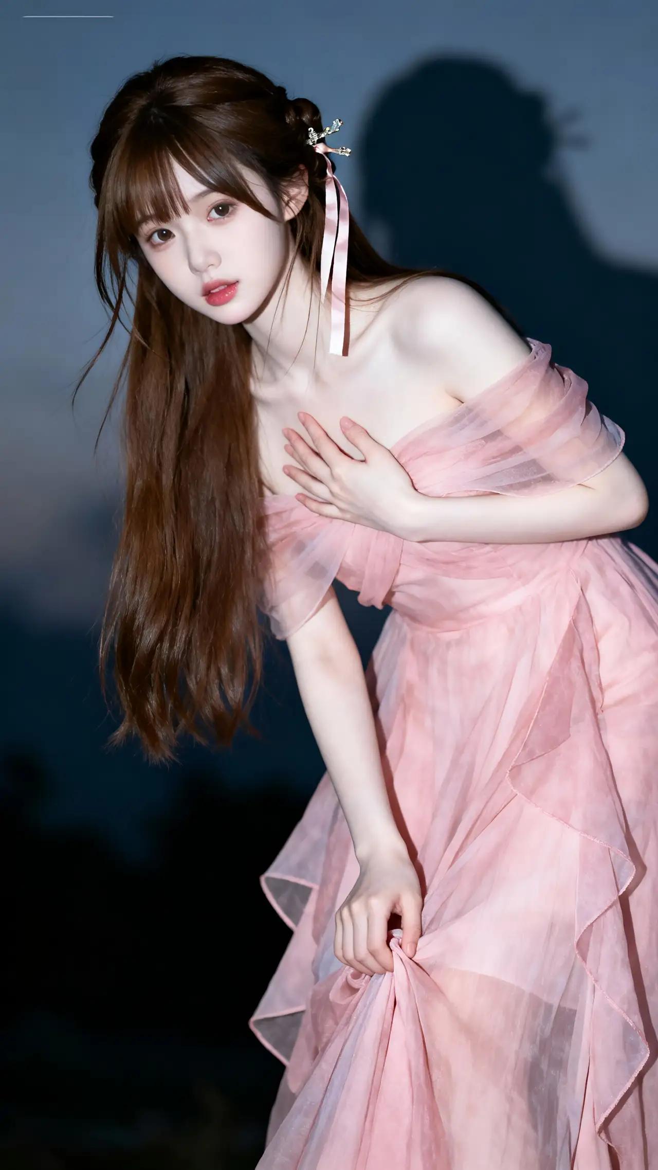 《粉色幻梦》 暮色像打翻的葡萄酒,在天鹅绒幕布上洇出深紫的涟漪。她站在光与影的交界处,粉色薄纱长裙忽然泛起珠光,仿佛有人把晚霞揉碎了织进绸缎里。双马尾上的丝带无风自动,缀在发间的珍珠发饰泛着贝母的光泽,让人想起威尼斯运河上随贡多拉摇晃的月亮。 当她的右手抚上心口,指尖陷进薄纱的褶皱里,忽然惊醒了沉睡在裙摆上的玫瑰暗纹。这些用银线绣成的花朵开始舒展花瓣,花蕊里渗出露水般的晶莹,将左胸前的蕾丝花边染成了初春的桃粉色。深棕发丝掠过锁骨时,那里便开出细小的珍珠梅——是去年在京都西阵织会馆,老师傅用金箔点染和服时,不慎遗落的星屑。 提起裙摆的左手忽然凝住,小指上的尾戒泛起冷光。霎时整个空间开始旋转,深色背景里浮出无数个黄昏的剪影:普罗旺斯的薰衣草田在裙摆上摇曳,托斯卡纳的葡萄藤缠上珍珠发饰,苏州绣娘的金线正穿过蕾丝孔隙。当所有光影碎片重组,她忽然听见十岁那年的蝉鸣——在老家阁楼的樟木箱底,那条被母亲收起来的粉色纱裙,此刻正在她身上苏醒。 耳垂上的珍珠突然发烫,映出瞳孔里流转的星河。当裙裾扫过虚空,忽然有细小的水晶从薄纱经纬中钻出,在空气中凝结成微型星图。这让她想起冰岛极光下的深夜,地质学家将火山玻璃磨成棱镜,折射出的虹彩与此刻裙摆的光晕在时空中相撞,融化成她睫毛上的水钻。 幕布般的深色背景开始流动,像被月光浸透的墨水。当双马尾丝带末端的水晶坠子叮当作响,整个空间忽然下起樱花雨。那些藏在裙褶里的记忆——巴黎歌剧院的红丝绒座椅,米兰大教堂的玫瑰窗,奈良春日大社的青铜灯笼——都在此刻的暮色中酿成永恒。而她胸前的玫瑰暗纹,正在渐浓的夜色里,悄然绽放成永不凋零的春天。