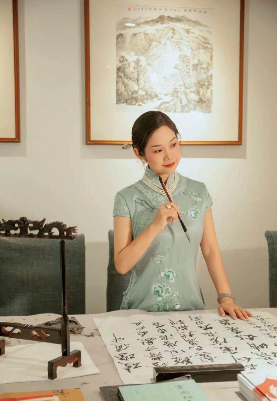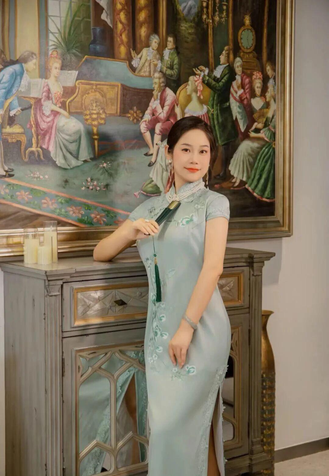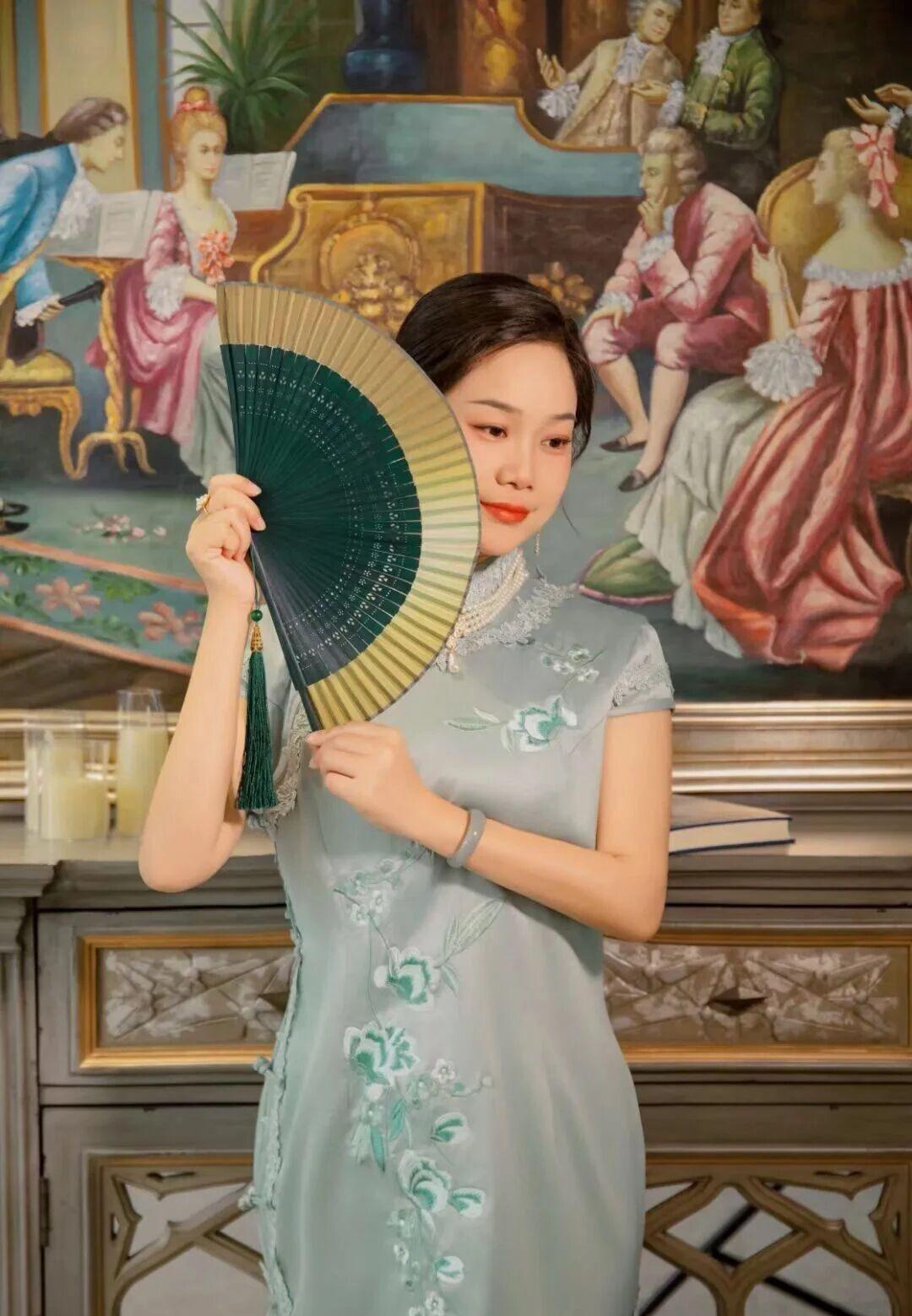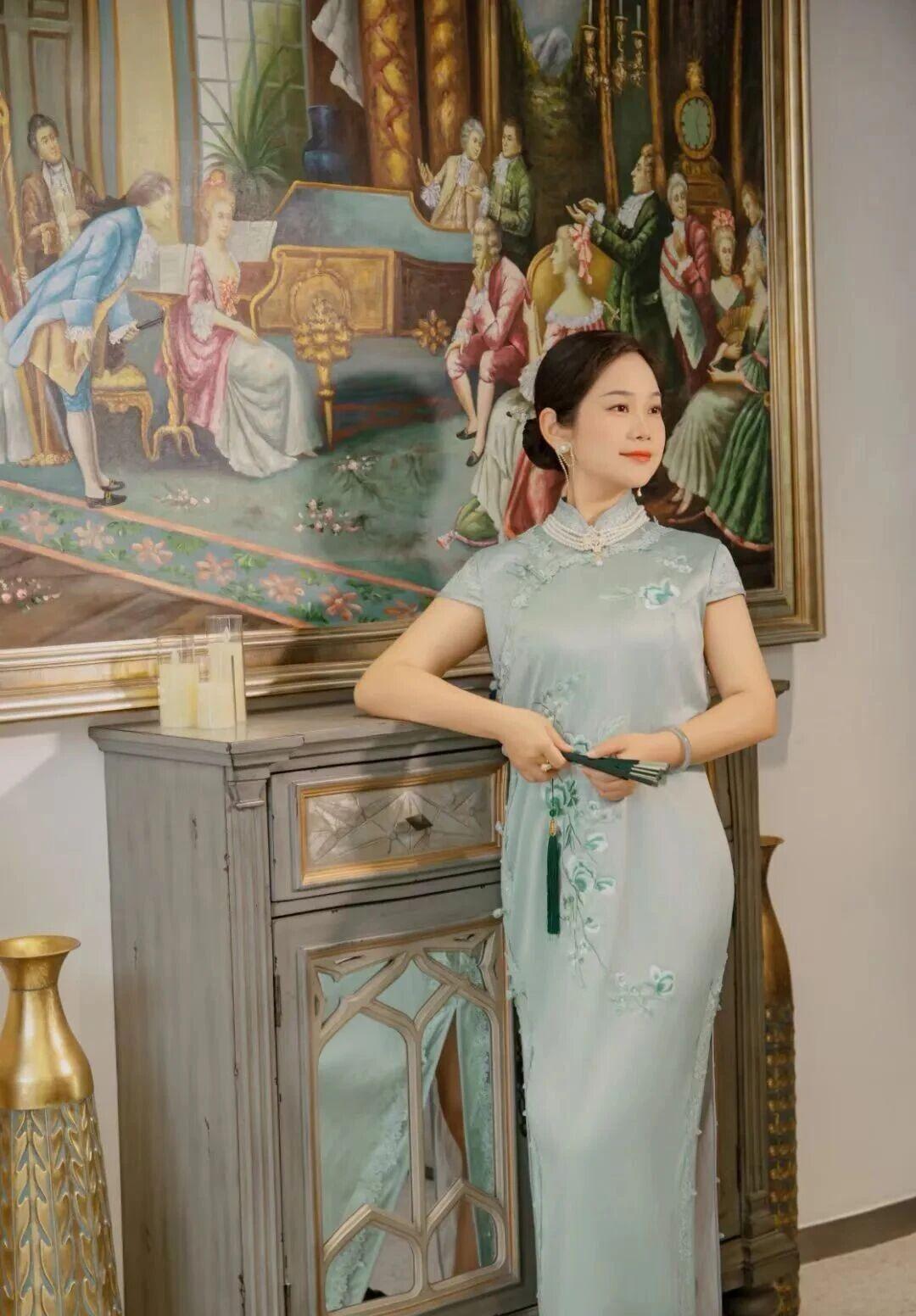 女生穿旗袍可以有多好看? 《时光交错的典雅》 浅蓝旗袍的丝绸流淌着晨露般的光泽,珍珠项链在颈间蜿蜒成月光凝成的河。她端坐在巴洛克油画前,青绿流苏从指间垂落,与画中贵妇裙裾的金线刺绣遥遥相望。烛台在雕花柜上投下摇曳的影,将两个时空的典雅融进同一片昏黄。 旗袍立领托起天鹅般的颈项,银线绣出的兰草在丝绸上舒展叶片。当指尖掠过盘扣,珍珠耳坠忽然轻轻摇晃——那是1937年外滩沙龙里,母亲留下的最后一件首饰。此刻画中提琴手的琴弓掠过G弦,惊醒了沉睡在旗袍褶皱里的往事:某个梅雨季的黄昏,梳妆镜前的手正为少女系上同款盘扣,窗外梧桐叶上的雨滴,恰似此刻珍珠表面的虹彩。 背景油画突然渗出松节油的气息,巴洛克裙摆的金线开始流动。她看见画中贵妇的羽扇微微倾斜,这个角度让扇骨与旗袍开衩处的暗纹形成隐秘的几何对应。当烛光忽然明灭,两个时空的丝绸同时泛起涟漪——青绿流苏扫过油画框的瞬间,画中人物睫毛轻颤,仿佛嗅到了来自东方的檀香。 柜门雕花的葡萄藤蔓开始生长,缠绕住旗袍下摆的银丝兰草。她无名指上的翡翠戒指忽然发烫,那是战乱年代藏在旗袍内袋的传家宝。此刻画中烛台的火苗窜高三寸,将两个时代的剪影投在斑驳墙面:穿浅蓝旗袍的她与戴假发的贵妇在光影中重叠,珍珠与钻石在时空中完成一场无声对话。 当最后一声提琴余韵消散,她起身时流苏扫过油画颜料未干的角落。青绿丝线在画布上拖出蜿蜒痕迹,像连接两个世纪的时光隧道。此刻旗袍上的银线兰草突然舒展,花瓣簌簌落在巴洛克裙摆的金线上——这是跨越三百年的美学共振,在烛光摇曳的黄昏,定格成永恒的诗行。