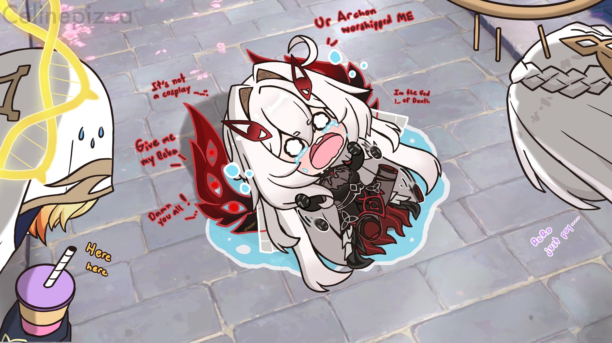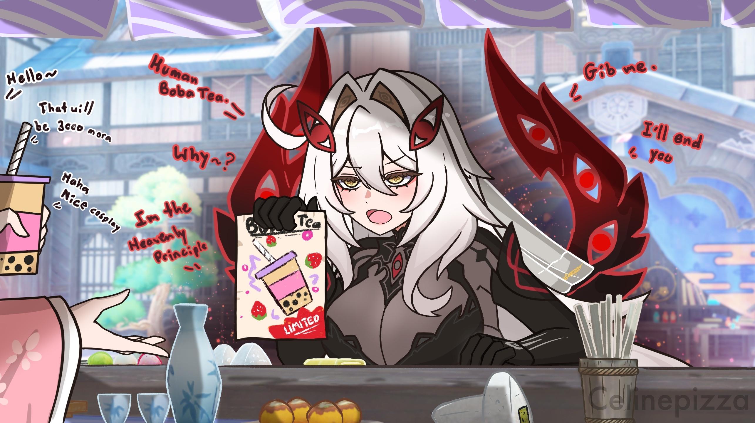 我是若娜瓦,天理,你们为什么就是不相信我。老板娘:你好~ 若娜瓦:人类,奶茶。 老板娘:总共3000摩拉。 若娜瓦:为什么~?我是天理,给我 若娜瓦:我便终结你 老板娘:哈哈,角色扮演很棒呢 若娜瓦:这不是Cos。把奶茶给我。你们的神曾崇拜我。我是死之执政。你们这些人类! 莱茵多特:来来来这里 伊斯塔露:若若,你就把钱给人家吧