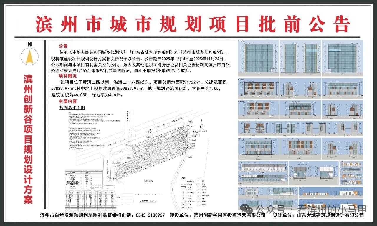 滨州“创新谷”项目规划方案公布 近日,《滨州创新谷项目规划设计方案》发布,项目位于滨州市黄河二路以南、渤海二十八路以东,总用地面积91722平方米,总建筑面积59829.97平方米,容积率1.05,建筑密度46.05%,绿地率4.61%。 该项目是山东省2025年重大实施类项目,总规划约800亩、总建筑面积约42万平方米,分三期开发,首期占地约247亩、规划建筑面积约10.04万平方米,涵盖单层标准厂房、研发中心、综合配套楼等,将依托滨州五大千亿级产业集群优势,聚焦高端智能智造企业需求,打造降本增效、环保绿色的一体化综合服务园区。 项目用地此前为苏学官村村盘,该村名源于洪武二年迁来此地、曾任官督学职的苏腊。 来源 综合滨州市自然资源和规划局