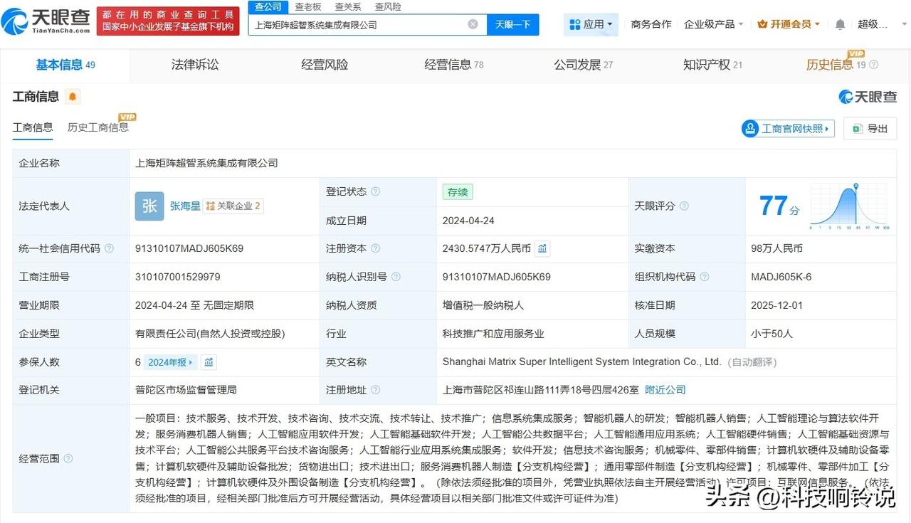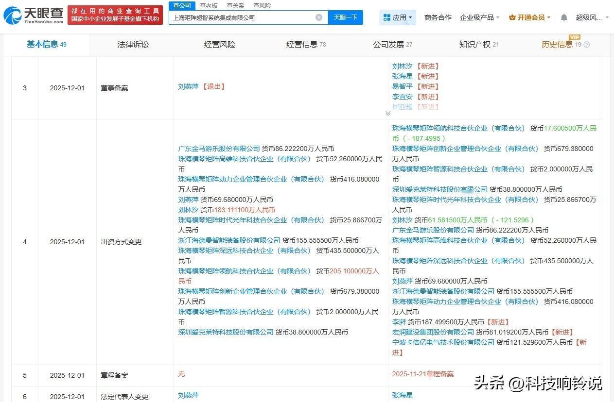 【卡倍亿、宏润建设入股矩阵超智 后者为人形机器人研发公司】 天眼查App显示,近日,上海矩阵超智系统集成有限公司发生工商变更,新增卡倍亿(300863)、宏润建设(002062)等为股东,注册资本由约2349.56万人民币增至约2430.57万人民币,同时法定代表人及主要人员均发生变更。 上海矩阵超智系统集成有限公司成立于2024年4月,经营范围包括智能机器人的研发、智能机器人销售、人工智能应用软件开发、人工智能基础软件开发等。股东信息显示,该公司现由珠海横琴矩阵创新企业管理合伙企业(有限合伙)、珠海横琴矩阵深远科技合伙企业(有限合伙)及上述新增股东等共同持股。公开信息显示,矩阵超智为人形机器人研发公司。 天眼查信息: