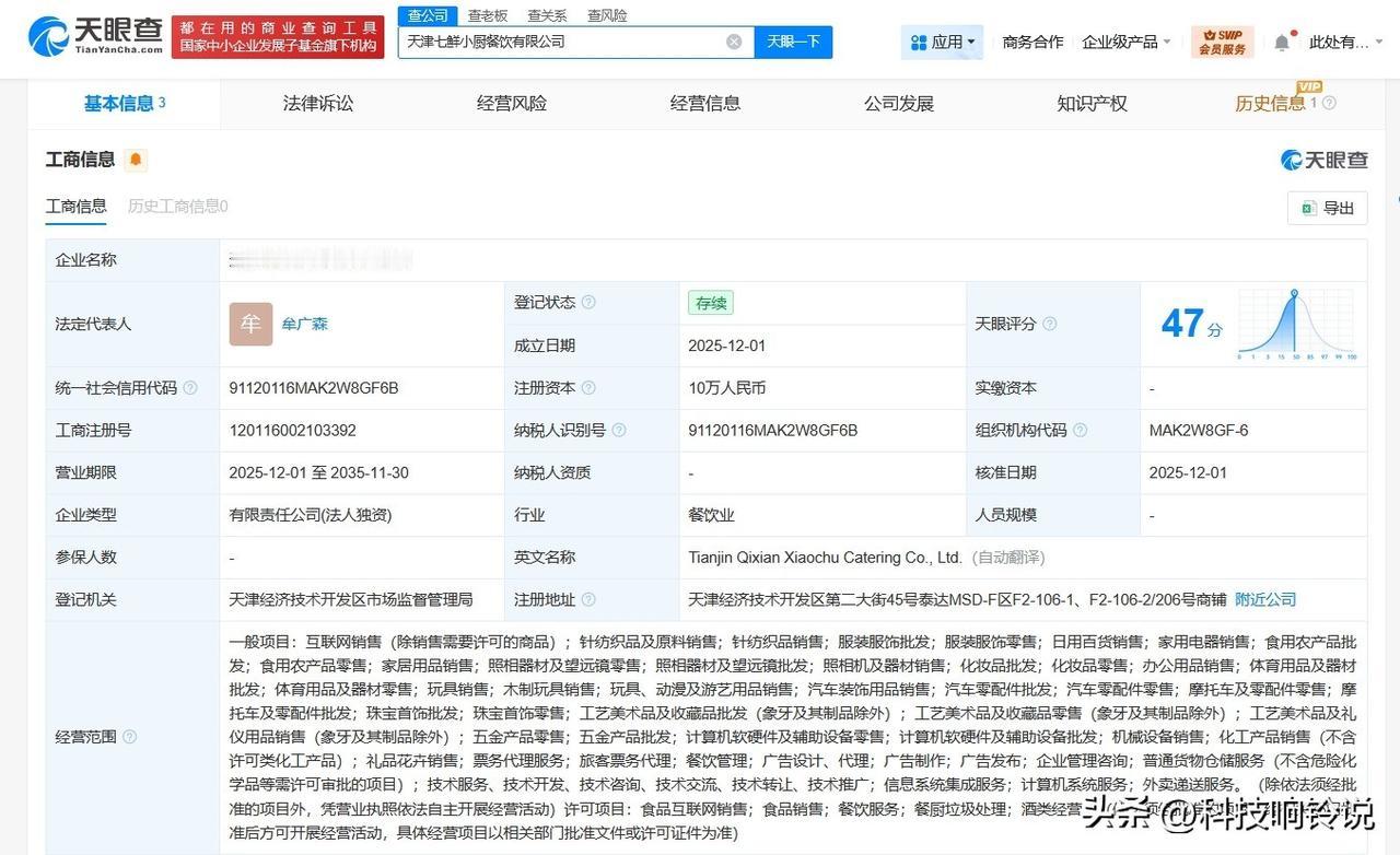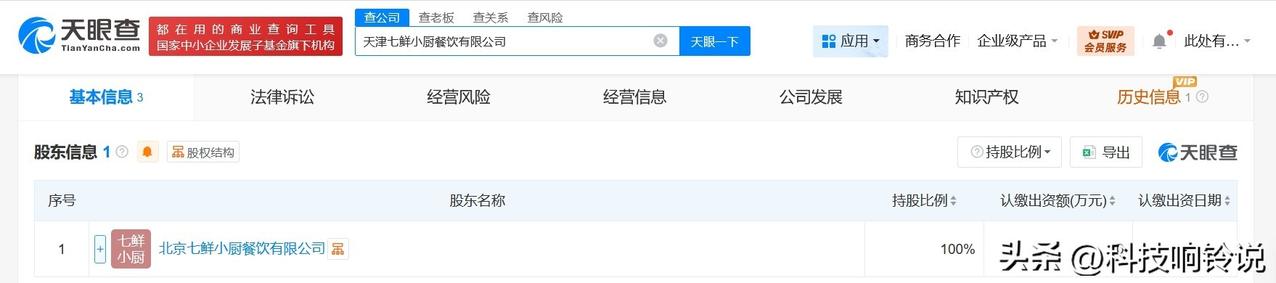 【京东七鲜小厨在天津成立新公司 京东七鲜小厨天津公司成立】 天眼查工商信息显示,12月1日,天津七鲜小厨餐饮有限公司成立,法定代表人为牟广森,注册资本10万人民币,经营范围含互联网销售、针纺织品及原料销售、日用百货销售、食用农产品零售、票务代理服务、旅客票务代理、餐饮管理等。股东信息显示,该公司由京东旗下北京七鲜小厨餐饮有限公司全资持股。 天眼查信息: