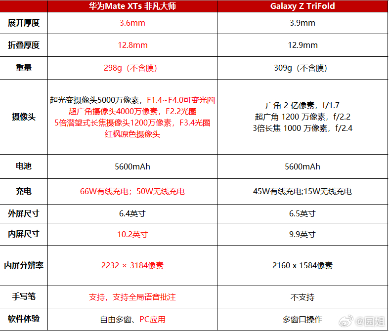 三星和华为两款折叠屏,华为是Z和三星是G形态,一个是既可以双屏三屏随时切换,一个是能保护内屏。不过单论完成度来说,我个人觉得华为的Mate XTs完成度更高,维修成本更低。另外除了硬件,软件也是决定使用体验的重要因素。目前绝大部分的主流应用都能适配华为的三折叠机型。但是三星的Galaxy Z TriFold刚发布,国内的软件适配应该还没完善。所以综合使用体验上来说,我觉得华为三折叠目前优势明显。不过站在消费者的角度来说,厂商间卷产品卷技术那肯定是对消费者有很大好处的。#三星首款三折叠手机发布##三星首款三折叠手机比华为晚一年#