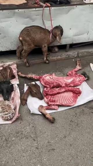 地上摊开的肉摊前 小羊被红绳拴着脖子 僵立在原地 浑身止不住地颤抖 四肢发软几乎站不稳 连呜咽都发不出一声 它或许不懂死亡的含义 但它知道地上那是妈妈熟悉的躯体 那是曾低头给它喂奶 用身体替它挡风雨的母羊 刚刚还钻到妈妈肚子底下喝奶 妈妈还回头冲我咩咩叫 如今只剩冰冷的骨肉分离 地上母羊的血肉还带着温度 可小羊的世界 却在这一刻彻底冷了 图源自网络