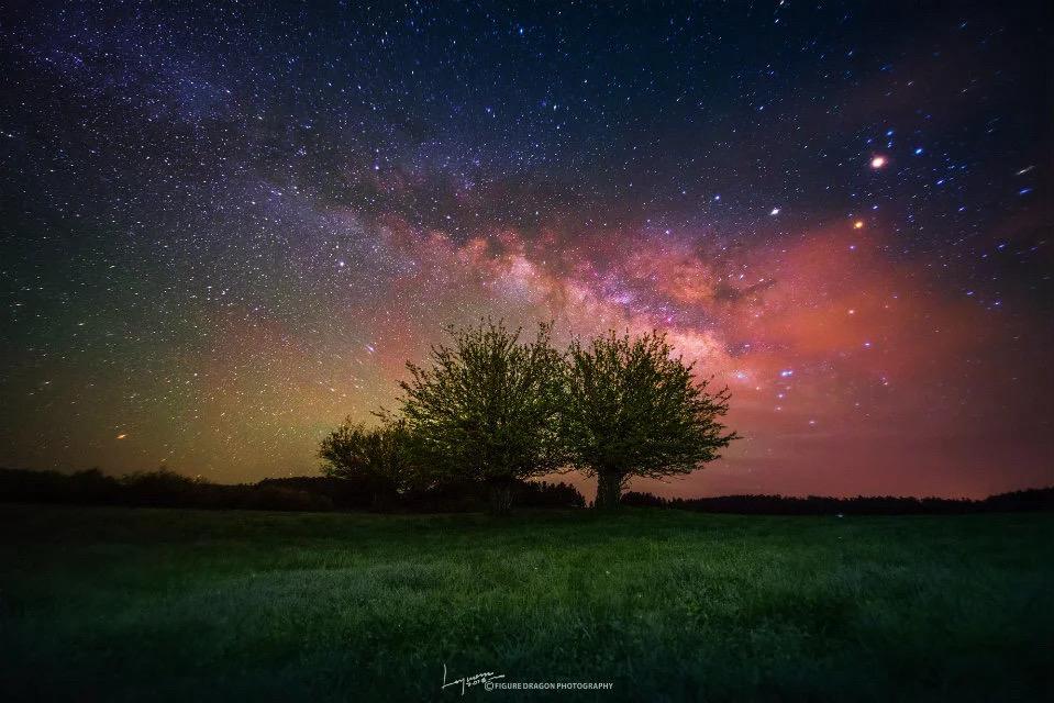 2016年裹着雾的银河与200公里的湿暖。2016 年的仙女山大草原,夜是浸在星河里的。我蹲在草甸上,三脚架支着镜头拍摄银河,紫粉的光带缠在树顶,连风里都裹着星子的凉。后半夜雾从脚底漫上来,湿汽顺着裤管往上爬,相机凉得像浸了水,可取景器里的银河还在淌,就舍不得收。