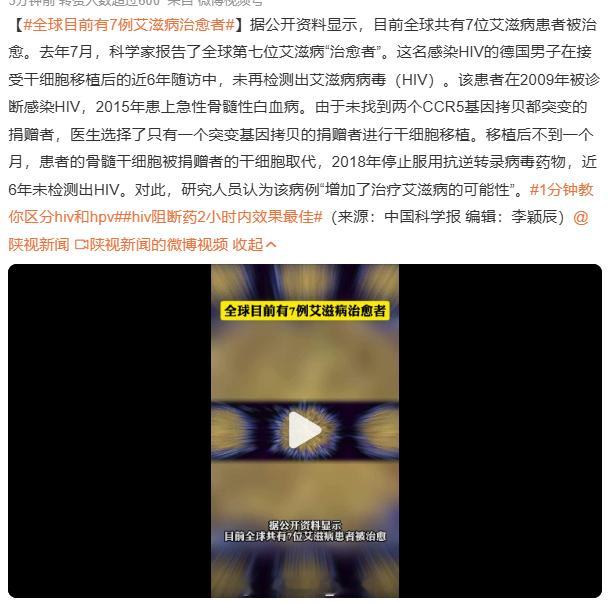 全球目前有7例艾滋病治愈者 喂!虽然说有案例,可是大家还是不要乱搞呀命不够硬还是不行...最好别整什么高危行为吧
