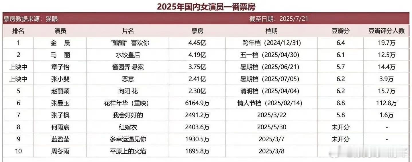 2025最具票房号召力女演员 又一位能扛票房的花旦。 金晨用《骗骗喜欢你》证实:小成本喜剧也能爆发大能量。市场给出了最真实的反馈。