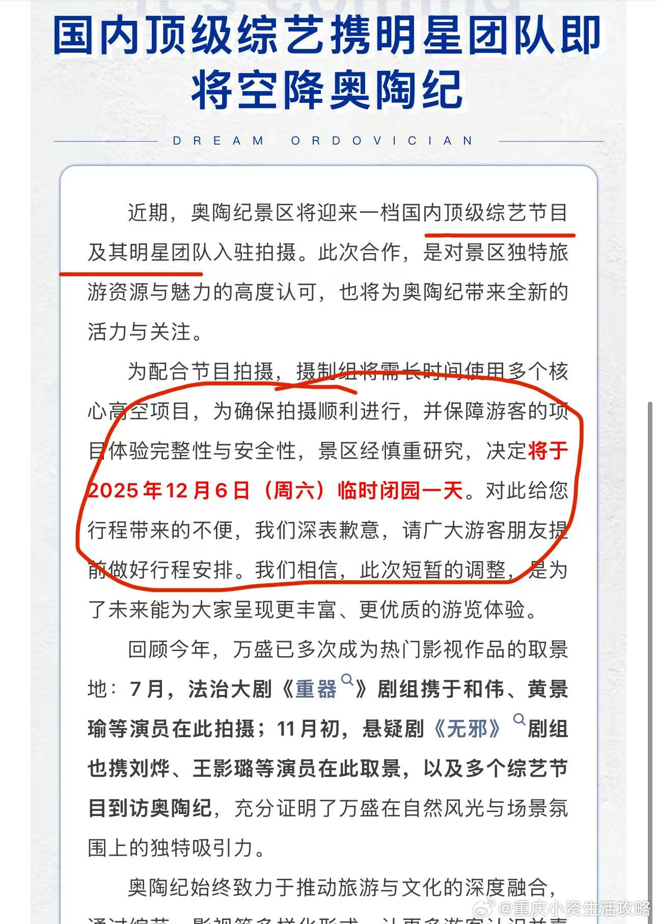 内部消息,奥陶纪被某个S+级综艺包场了!据说嘉宾阵容吓人。奥陶纪与S+级综艺的碰撞梦幻奥陶纪景区综艺录制新地标奥陶纪