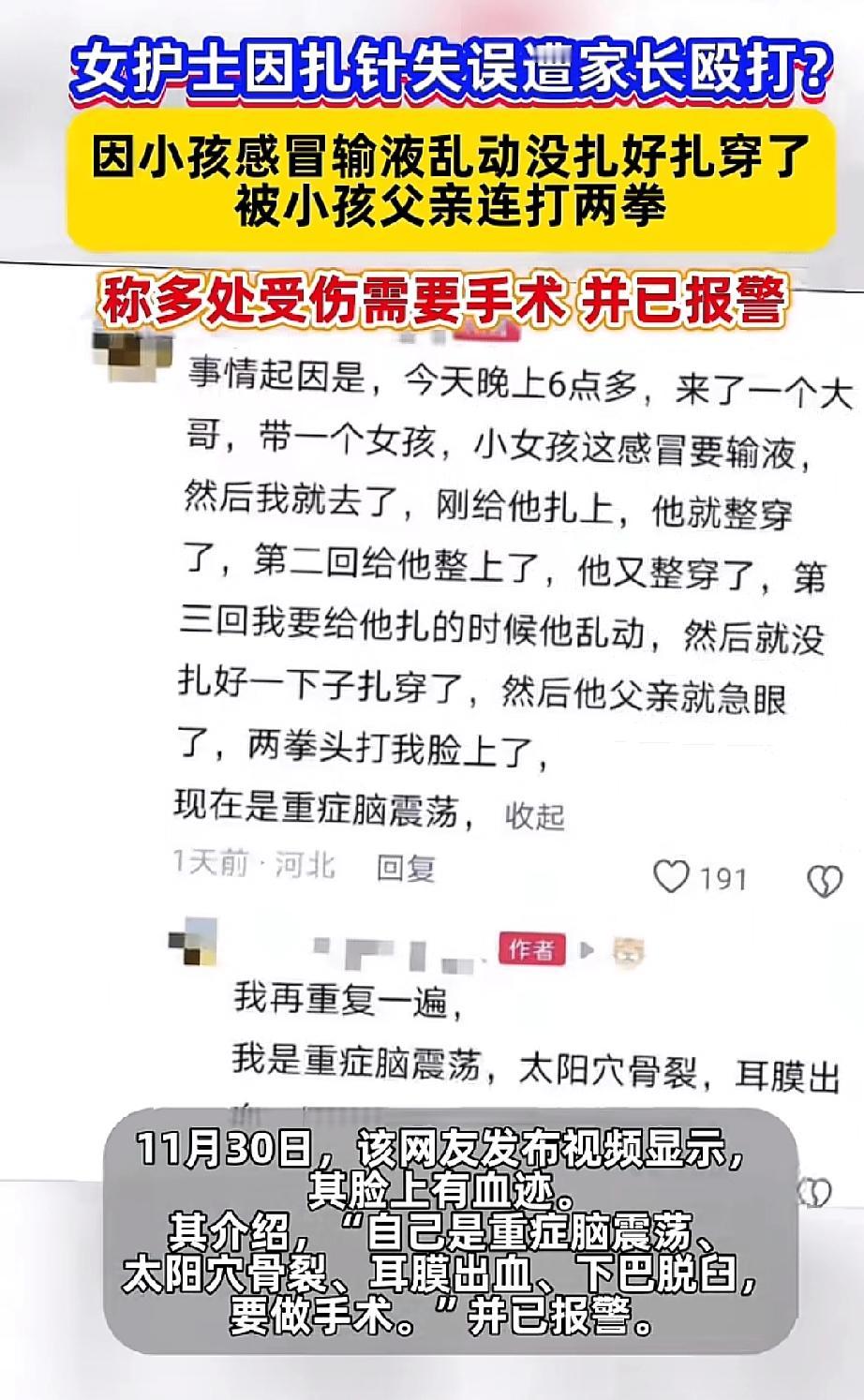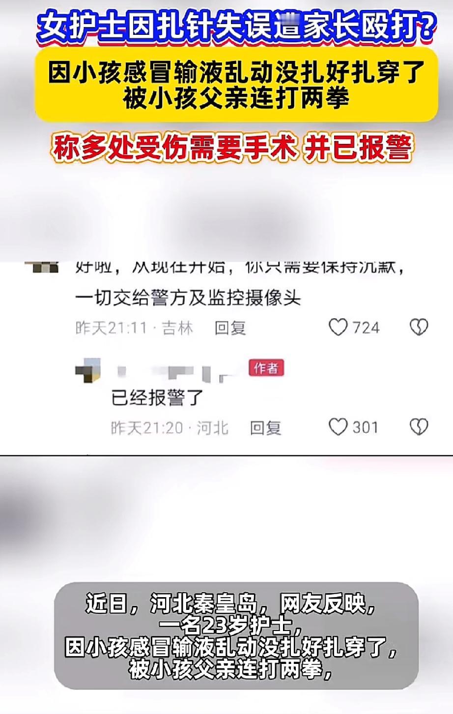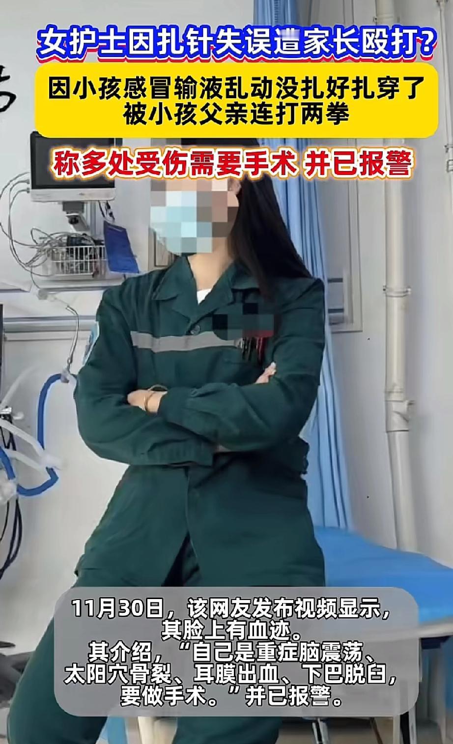 秦皇岛,一名23岁的女护士为患感冒的女孩打吊瓶,连扎三针,女孩疼得哭了起来,女孩父亲愤怒之下挥拳砸向护士,致使护士重度脑震荡、下巴脱臼、太阳穴骨裂、耳膜出血,需手术治疗。 女护士自述,第一次扎针打好点滴后,孩子乱动致使针头穿孔,手背鼓起包了,于是有了第二次扎针,扎好针后,孩子依旧乱动,针头再次穿孔。 护士扎第三针时,孩子胳膊还是动来动去,针头一下子就扎穿了,孩子吃痛哭了起来,父亲见状急了,朝护士打了两拳。 护士自拍视频发至网上,视频中她满脸是血,称已经报警。 有网友质疑护士说谎,护士回应道:“医院里有监控视频为证。” 能理解父亲心疼女儿,连扎三针孩子遭了不少罪。但倘若真是女儿一直乱动才导致连扎三针,那父亲也有监管孩子不力的责任。 从护士的自述来看,其伤情十分严重,父亲不仅要面临医药费赔偿问题,还需承担刑事责任。 这两拳的后果极为严重,切勿被一时的怒气冲昏头脑,不假思索就动手。要知道如今是法治社会,谁先动手谁就要负全责的。 儿科的护士属实很难做,儿童的血管细如发丝,又难控好动天性,稍有挣扎挥臂,就可能让一针精准穿刺的努力付诸东流。有些家长便会因此责怪工作中的护士。 希望家长能理解护士工作的辛苦,护士也能理解家长疼爱孩子的心情,彼此退一步海阔天空。 来源:潇湘晨报