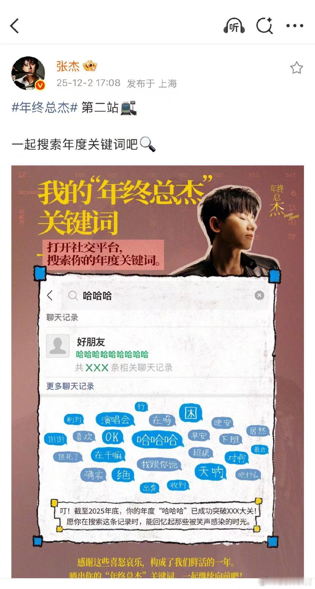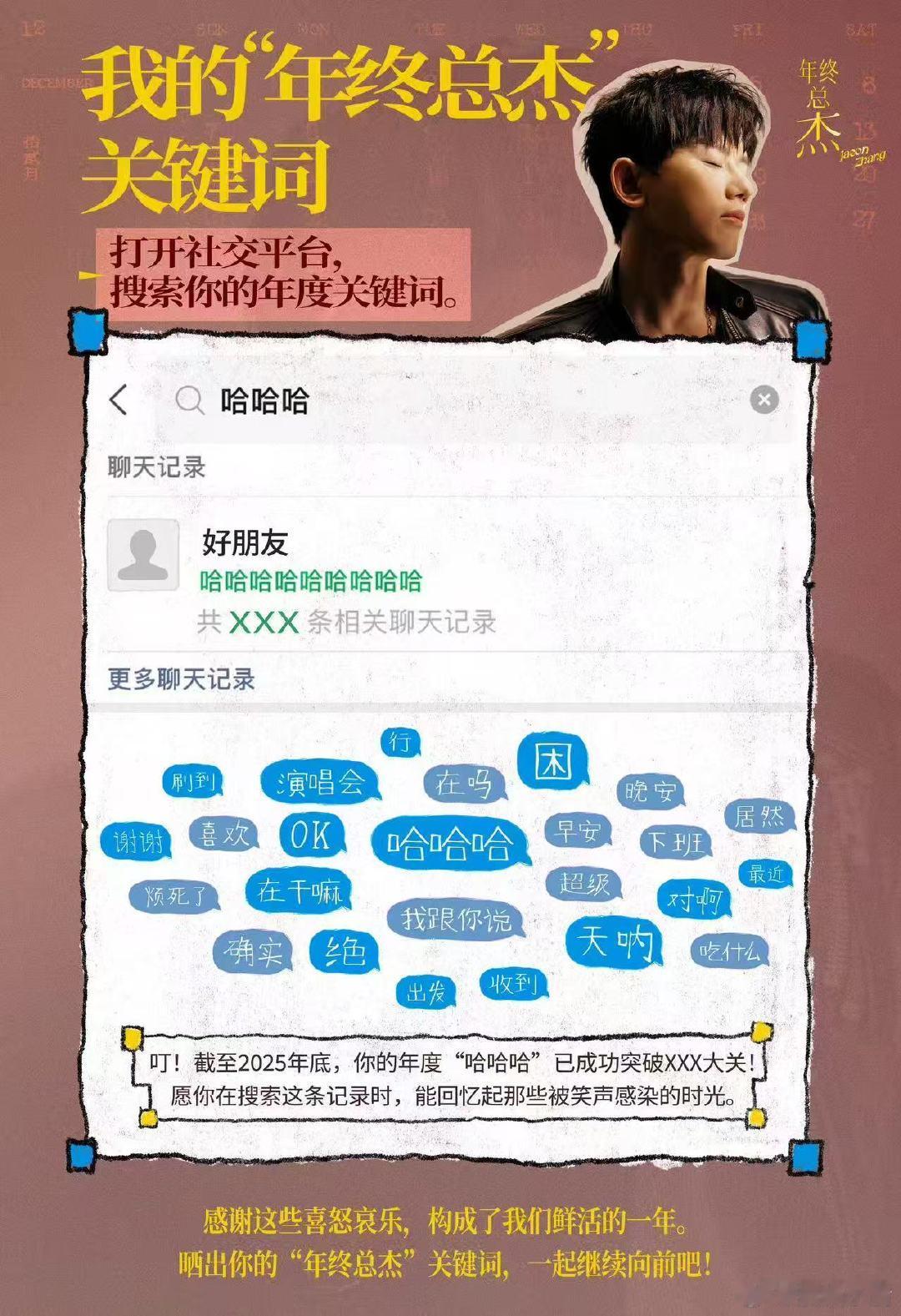 年终总杰 的年终总结互动驶入第二站!一起打开社交平台,搜索聊天关键词,让那些充满着回忆的痕迹悄然浮现。快带上你的搜索截图,和杰哥一起见证文字背后的温暖回忆!