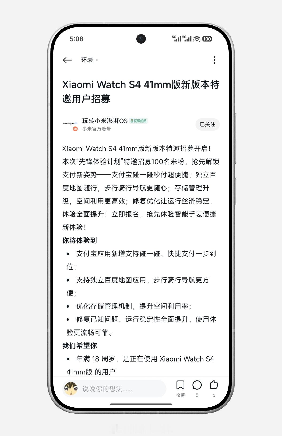小米澎湃OS3 Xiaomi Watch S4 41mm版新版本特邀招募开启!本次“先锋体验计划”特邀招募100名米粉,抢先解锁支付新姿势——支付宝碰一碰秒付超便捷;独立百度地图随行,步行骑行导航更随心;存储管理升级,空间利用更高效;修复优化让运行丝滑稳定,体验全面提升!立即报名,抢先体验智能手表便捷新体验!