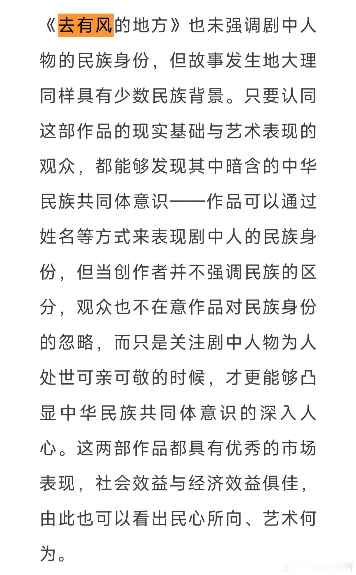 核心期刊《中国电视》2025第7期刊登的论文《回顾与展望——国产剧集中的中华民族共同体意识塑造》提到——《去有风的地方》也未强调剧中人物的民族身份,但故事发生地大理同样具有少数民族背景。只要认同这部作品的现实基础与艺术表现的观众,都能够发现其中暗含的中华民族共同体意识——作品可以通过姓名等方式来表现剧中人的民族身份,但当创作者并不强调民族的区分,观众也不在意作品对民族身份的忽略,而只是关注剧中人物为人处世可亲可敬的时候,才更能够凸显中华民族共同体意识的深入人心。这部作品具有优秀的市场表现,社会效益与经济效益俱佳,由此也可以看出民心所向、艺术何为。(23年的剧现在还在上期刊去有风的地方