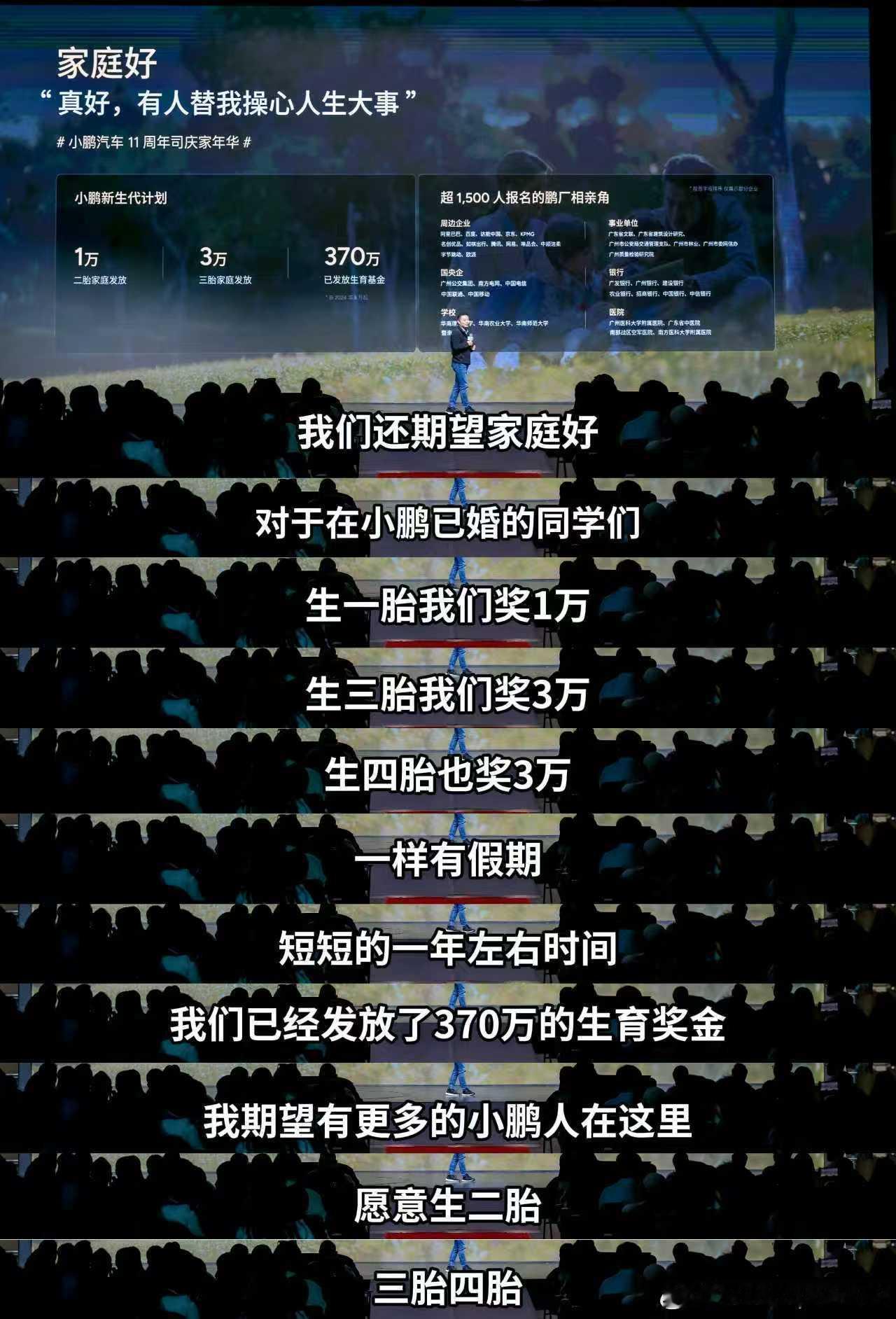 11月29日,小鹏首届家庭日成功举办,2万余名员工及家属齐聚,一场沉浸式 “家” 年华融合科技体验与人文关怀,“鹏二代”首次走进父母创造的科技世界,沉浸式体验AI汽车、机器人与飞行汽车等未来科技。何小鹏在家庭日中分享,小鹏以 “吃好、身体好、学习好、家庭好、福利好、氛围好”的“六个好”构建全方位员工关怀体系,累计发放370万生育奖金,配套2万平方米、超400种菜品的员工餐厅、超8万平方米内部公园等设施,“十险五金” 覆盖超 50 项权益。除此之外,何小鹏更是在相亲角化身 “月老” 为员工婚恋支招,据悉,小鹏家庭日的相亲角联动了广州超50余家单位搭建社交桥梁,吸引 1500 名大湾区青年参与;另外,何小鹏还以“暖心学长”身份与员工家属及车主互动,深化 “大家庭” 温暖联结。小鹏已向员工发放370万生育基金何小鹏家庭日化身相亲角月老为员工支招