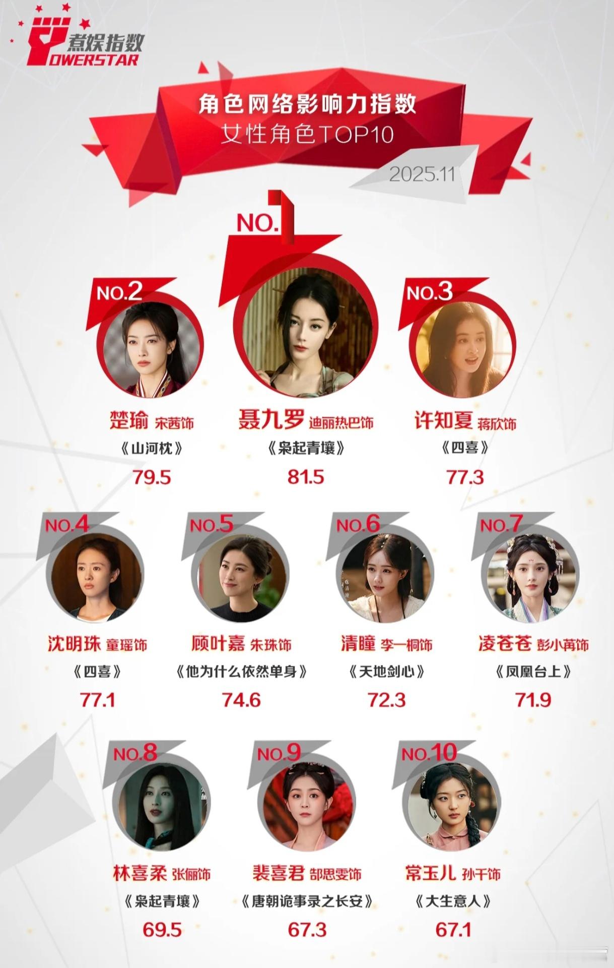 11月女性角色网络影响力指数TOP10——宋茜《山河枕》楚瑜,位列TOP2!山河枕
