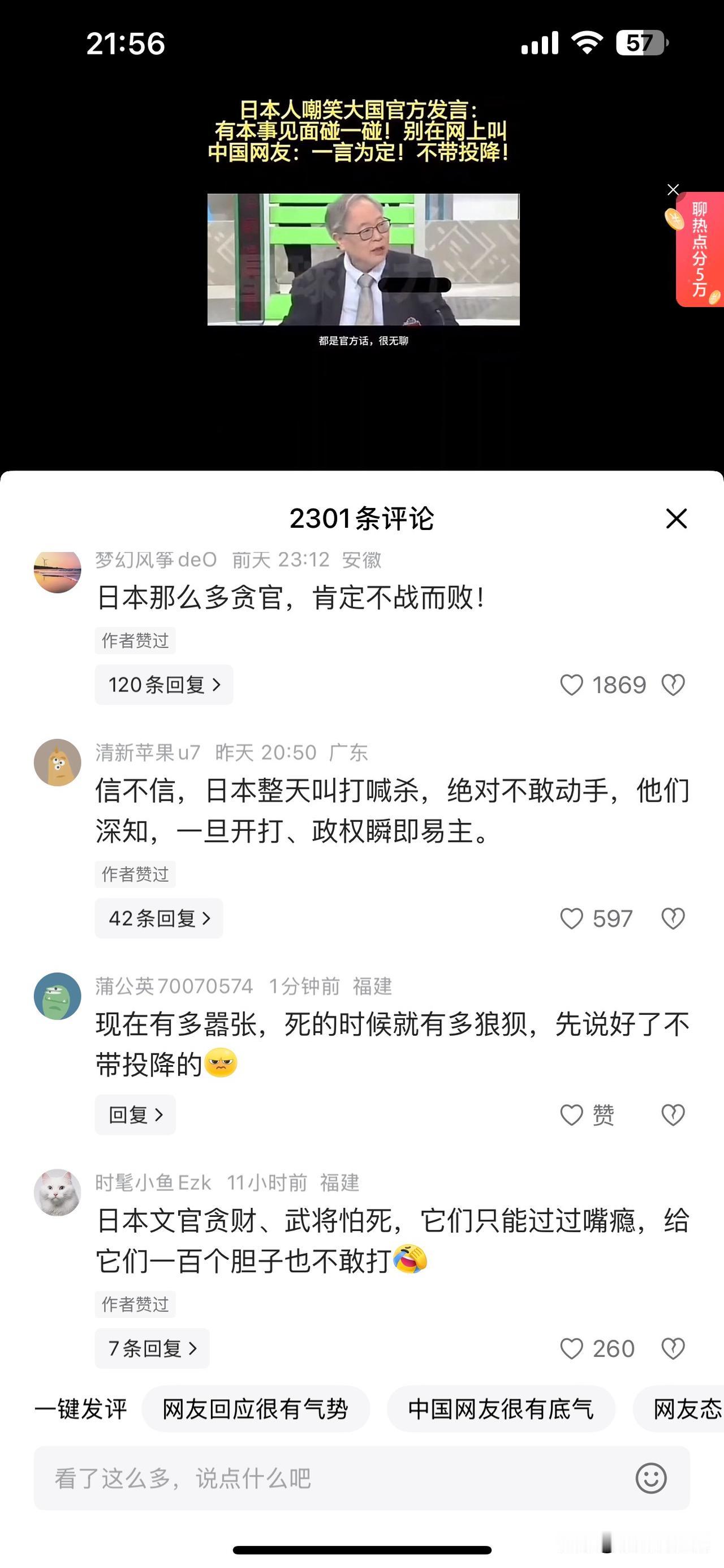 日本最近很嚣张 日本国内最近十分嚣张,针对大国的克制,表现出无知的无畏,令人发笑。 日本人在电视访谈中,嘲笑大国的官方发言,叫嚣有本事见面碰一碰,别在网上叫。 大国网友回答:一言为定,不带投降的啊。 有网友说,就你们日本那么多贪官,肯定不战而败。 还有网友说:信不信,你们天天在网上叫嚣打打杀杀,绝对不敢动手,一旦真正开打,政权瞬即易主! 更有网友一针见血的指出,日本军队军备落后,贪腐成风,军心涣散,战斗打响肯定一溃即散土崩瓦解! 真不知道日本哪来的自信! ——————————