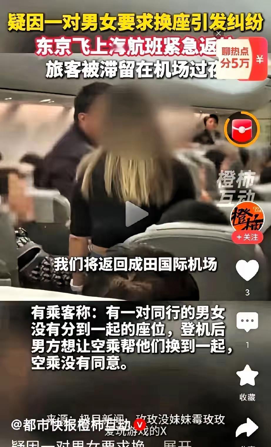 好不容易在日本买上机票回国, 2小时40分就能到上海, 结果就因为一个座位,男乘客跟空乘死缠烂打2小时,让飞了大半路程的飞机硬生生掉头飞回东京,这操作真的刷新自私下限! 他自己被警方带走不说,满飞机人全被连累,深夜滞留在机场,只能在长椅上凑合一晚,航司给的补偿金根本抵消不了这份折腾。 别拿“计较”当借口,飞机上的秩序从来不是私事,而是关乎整机人的安全,这种妨碍航班运行的行为,早就超出了合理诉求的范畴。 坐飞机不是耍性子的地方,每个乘客都得守规矩,你的任性不能让所有人买单。 你觉得该怎么约束这种影响公共出行的行为?来评论区聊聊~