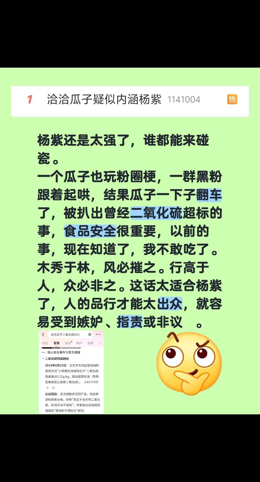 洽洽瓜子疑似内涵杨紫上热搜,是不是内涵,我不太知道,看到洽洽瓜子曾经二氧化硫超标