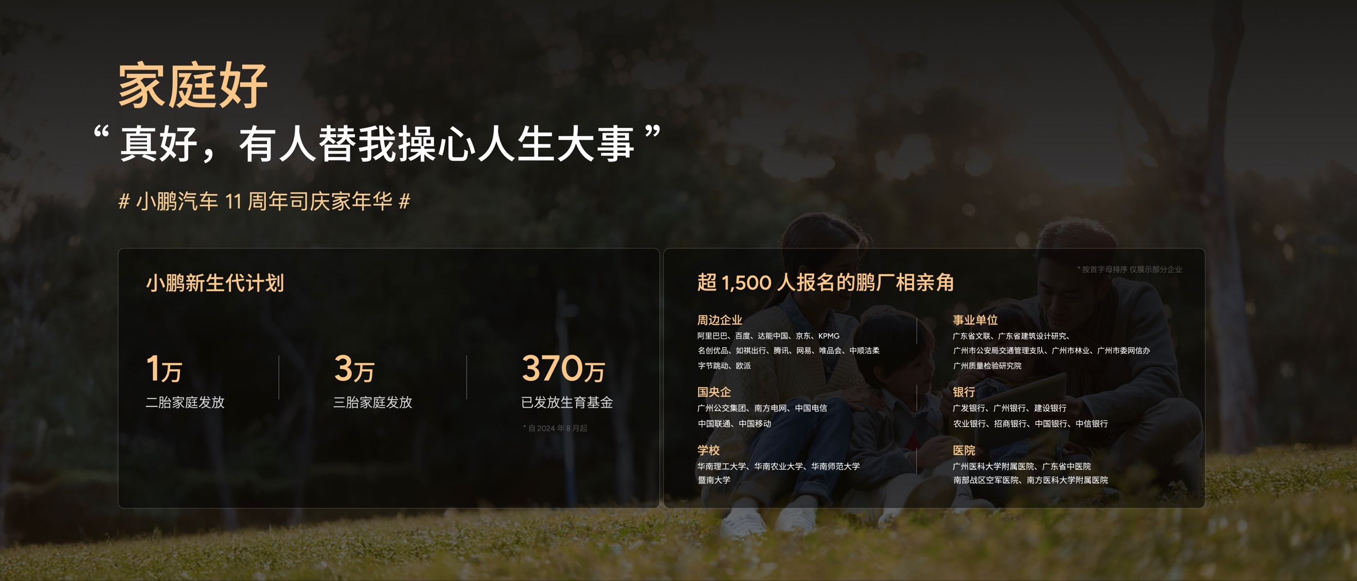 很多人觉得大厂没有“人情味”?这次窝鹏用行动发声了。11周年庆小鹏在广州新总部举办了首届家庭日,还挺热闹的。这是小鹏汽车成立以来规模最大的一次家庭日活动,同时也是新总部首次向员工家属开放参观。除了现场的美食、音乐、科技活动,小鹏在员工福祉和家庭关怀方面公布了“六好理念”:“吃好、身体好、学习好、家庭好、福利好、氛围好”,听起来挺接地气的。具体的落地上,小鹏已经累计发放超370万生育基金,另外对青年人才也有针对性的扶持,也就是说,从工作到家庭,小鹏都考虑到了。小鹏已向员工发放370万生育基金何小鹏家庭日化身相亲角月老为员工支招