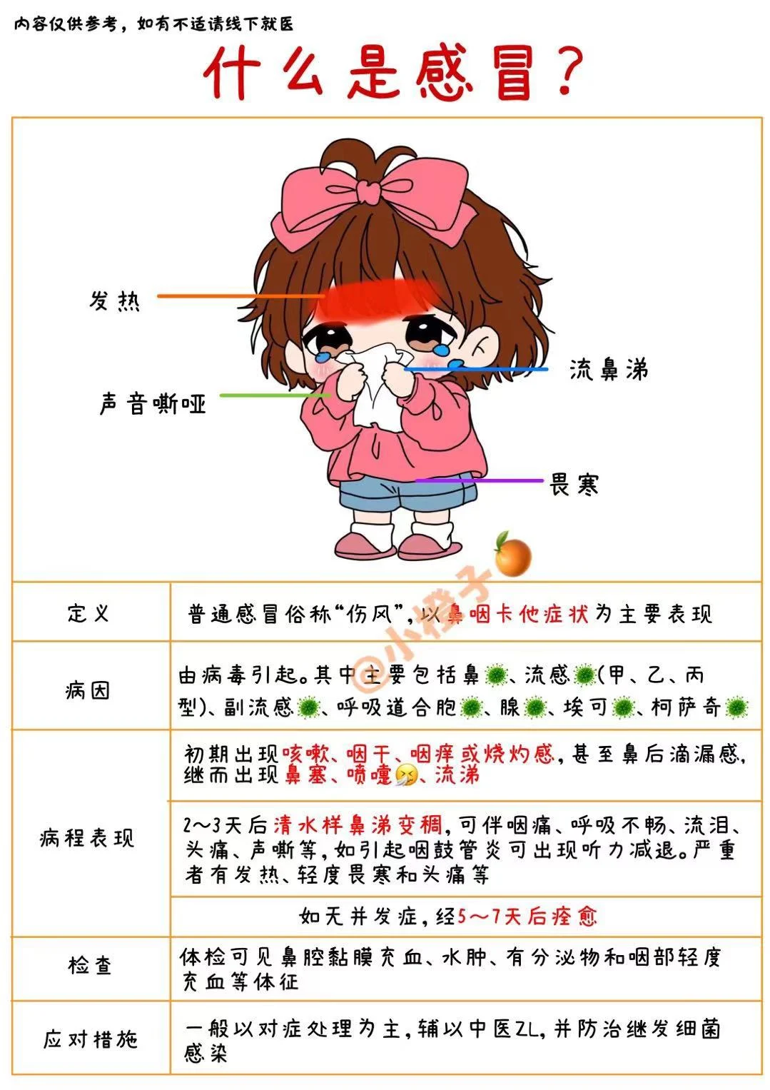 普通感冒称为“伤风”,以鼻咽卡他症状为主要表现。除了鼻部症状(如鼻塞、打喷嚏🤧、流鼻涕)外,通常还伴有全身症状,如咽喉痛、头痛、发热、乏力、肌肉酸痛等。感冒的鼻涕可能由清涕逐渐转为脓鼻涕。