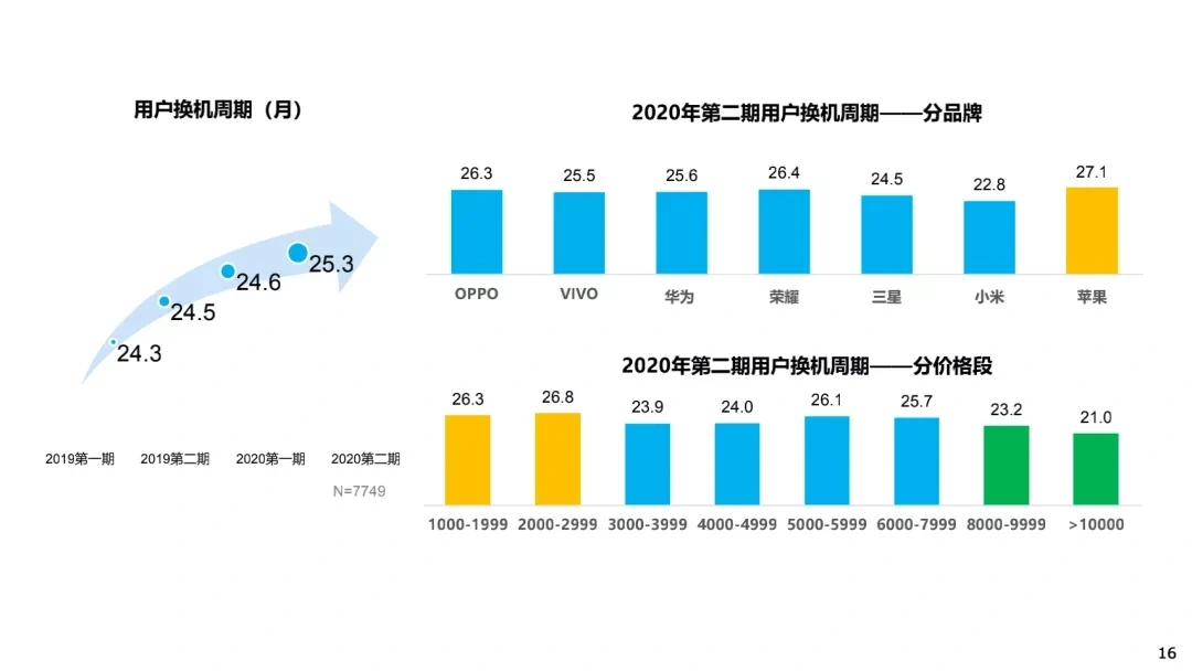 性能肯定是够用四年的,但想必很多人都等不了4⃣️年吧! 从中国移动终端实验室给出的数据可以看到,🍎用户的换机周期平均达到了27.1个月,也就是两年左右,就这都已经算是比较久的了。 iPhon