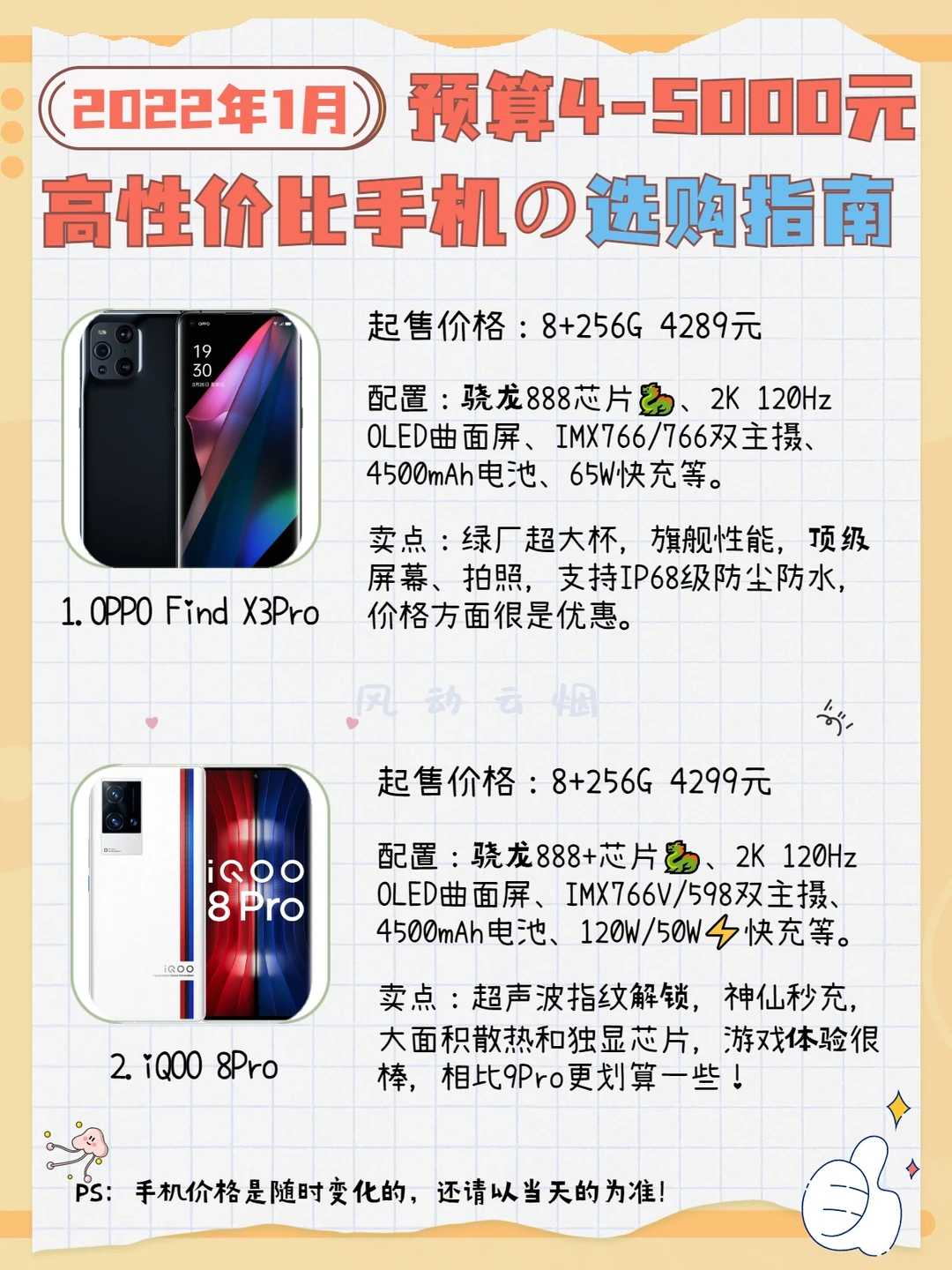 2022年手机推荐第五弹来啦😘,本期推荐的高性价比手机一共有5⃣️款,它们分别是: 1⃣️OPPO Find X3Pro:4289元💰起售; 2⃣️iQOO 8Pro:4299元💰起售;