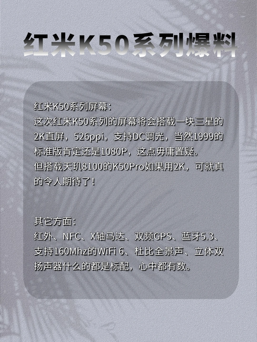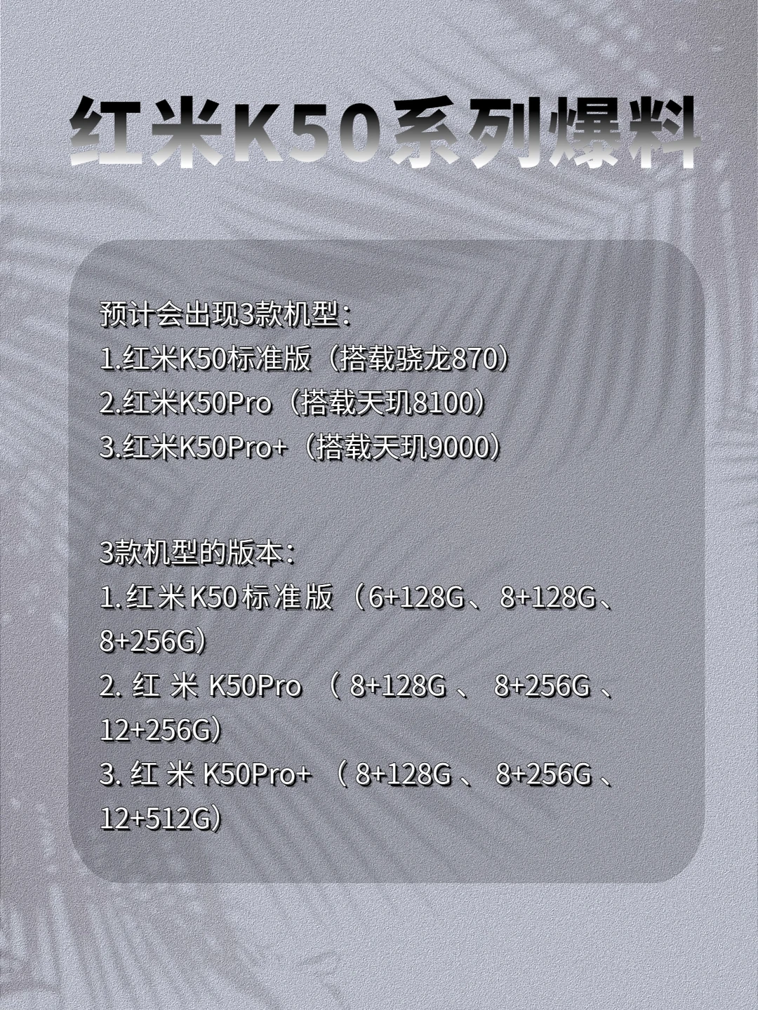3月17号📅的红米K50系列📱发布会,预计会出现3⃣️款机型: 红米K50标准版✨、红米K50Pro💫和红米K50Pro+🌟,分别搭载骁龙870、天玑8100和天玑9000三款处理器。