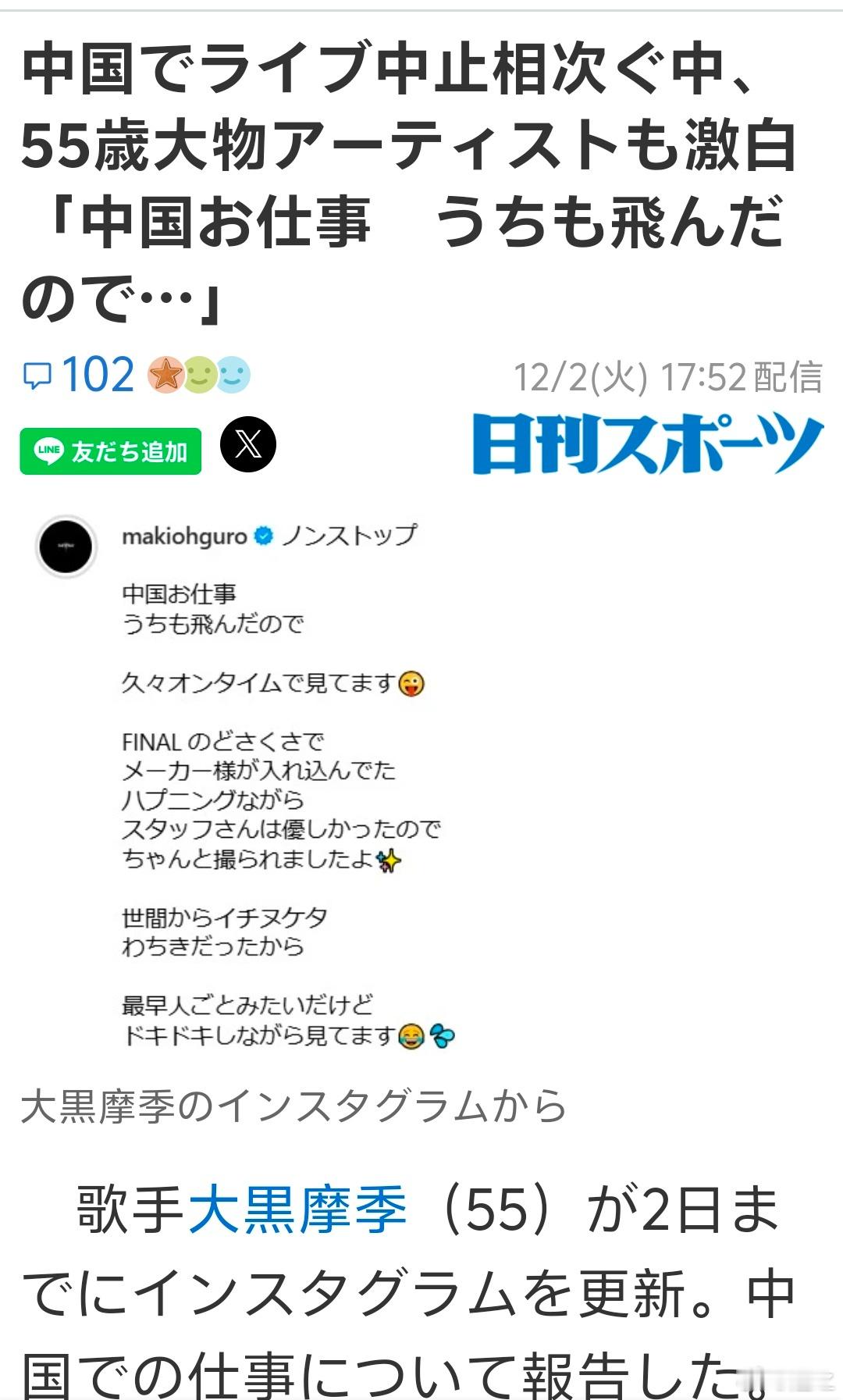 唱灌篮高手的大黑摩季也ins发言说,中国的工作,我们的团队也飞过去了。一开始乍一看还以为她也是来中国被叫停了呢。原来是富士电视台电视台在播她今年四月来中国开演唱会的一些内容啊。真的要不是这次日本搞事都不知道有这么多日本艺人到中国来活动。刚才看凉宫春日的忧虑那个给长门有希配音的茅原也来了,不过被喊停回去了。日本艺能人本来就收入不高,和中国没法比的。