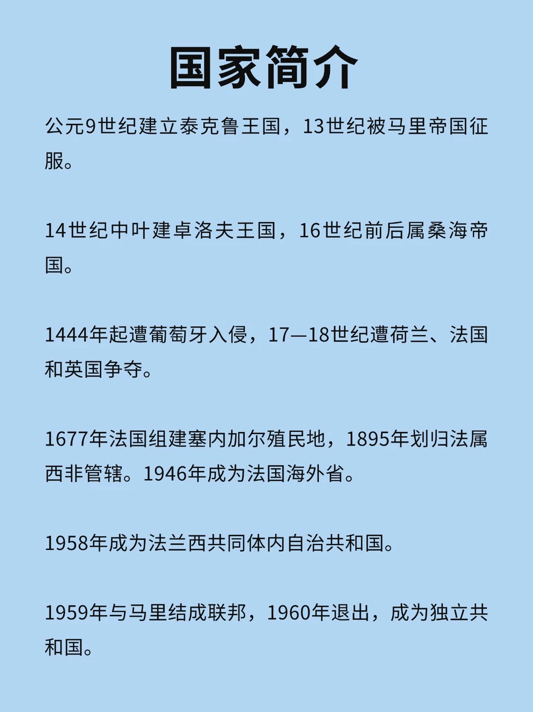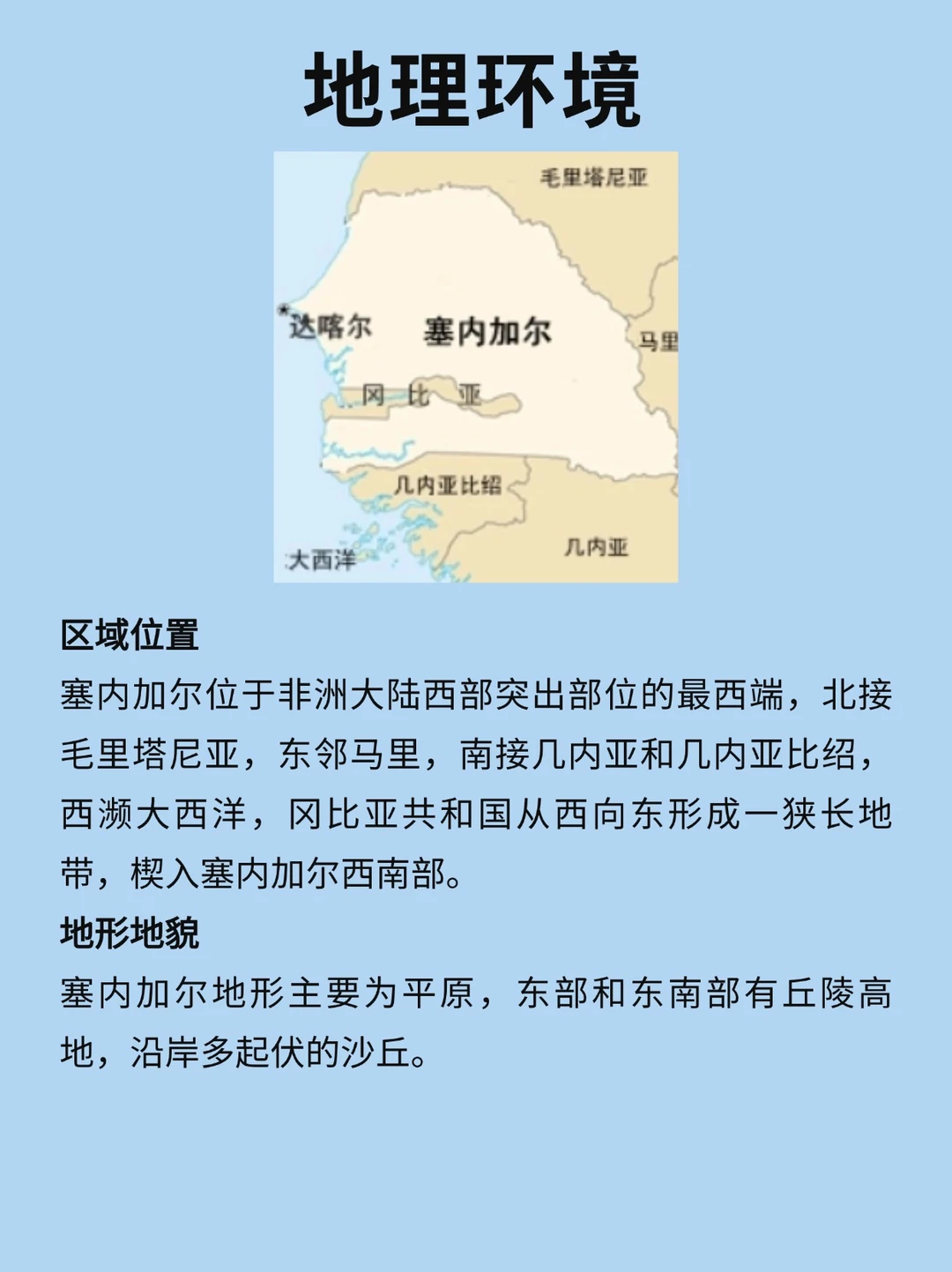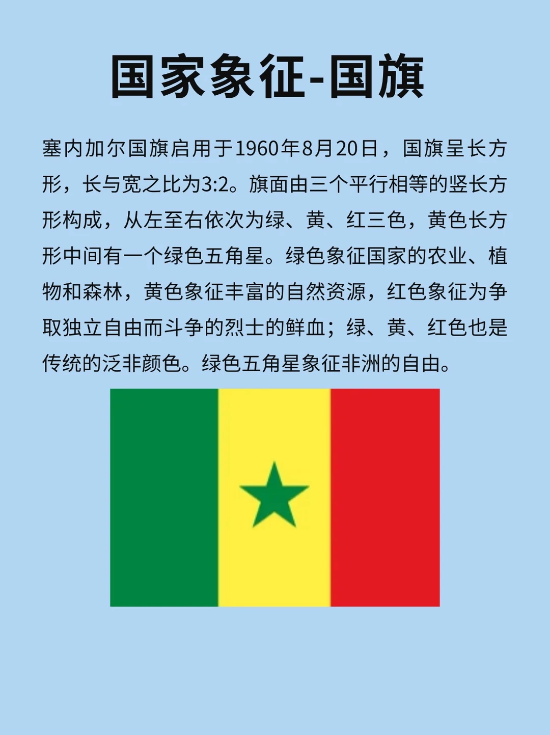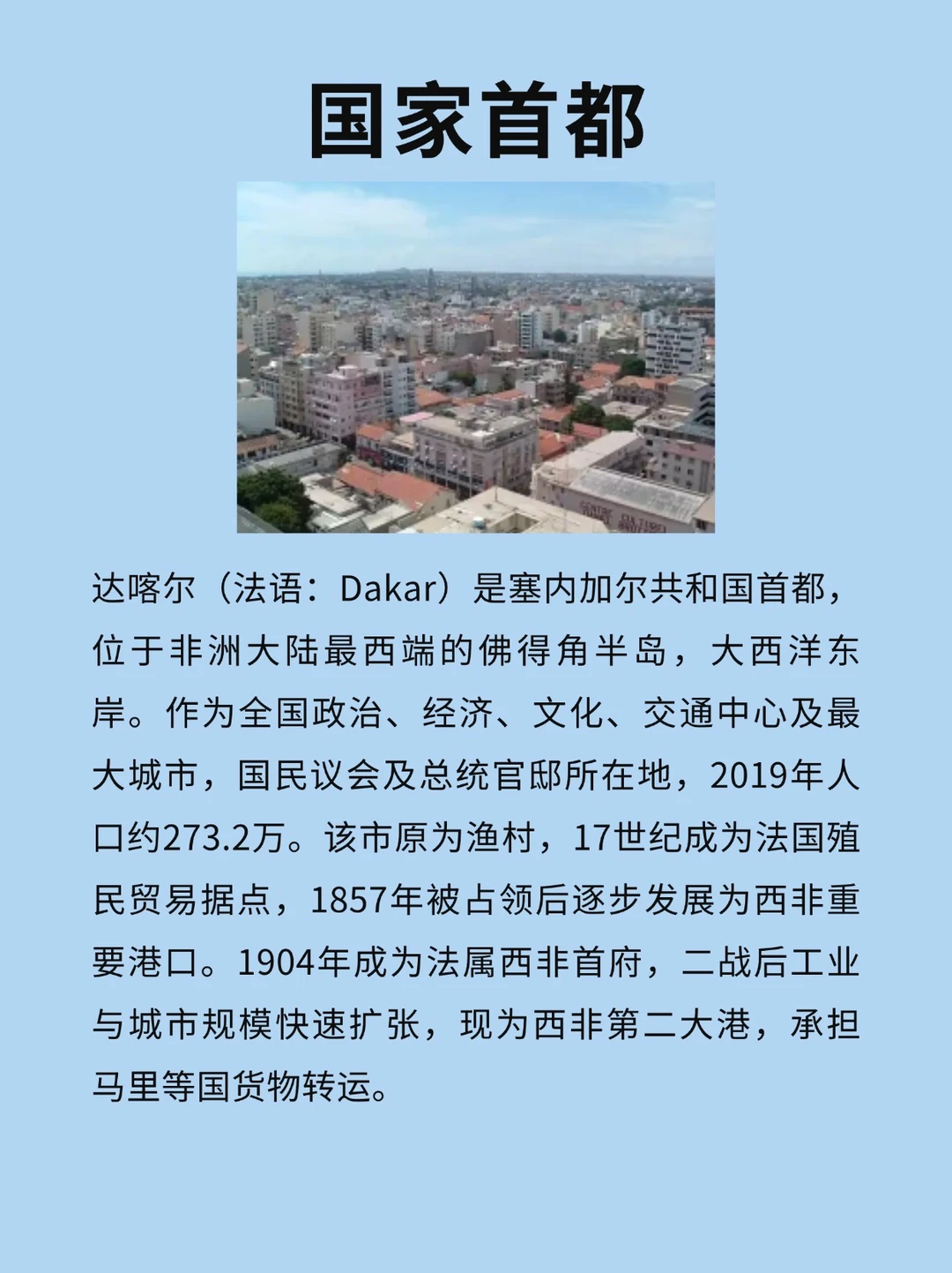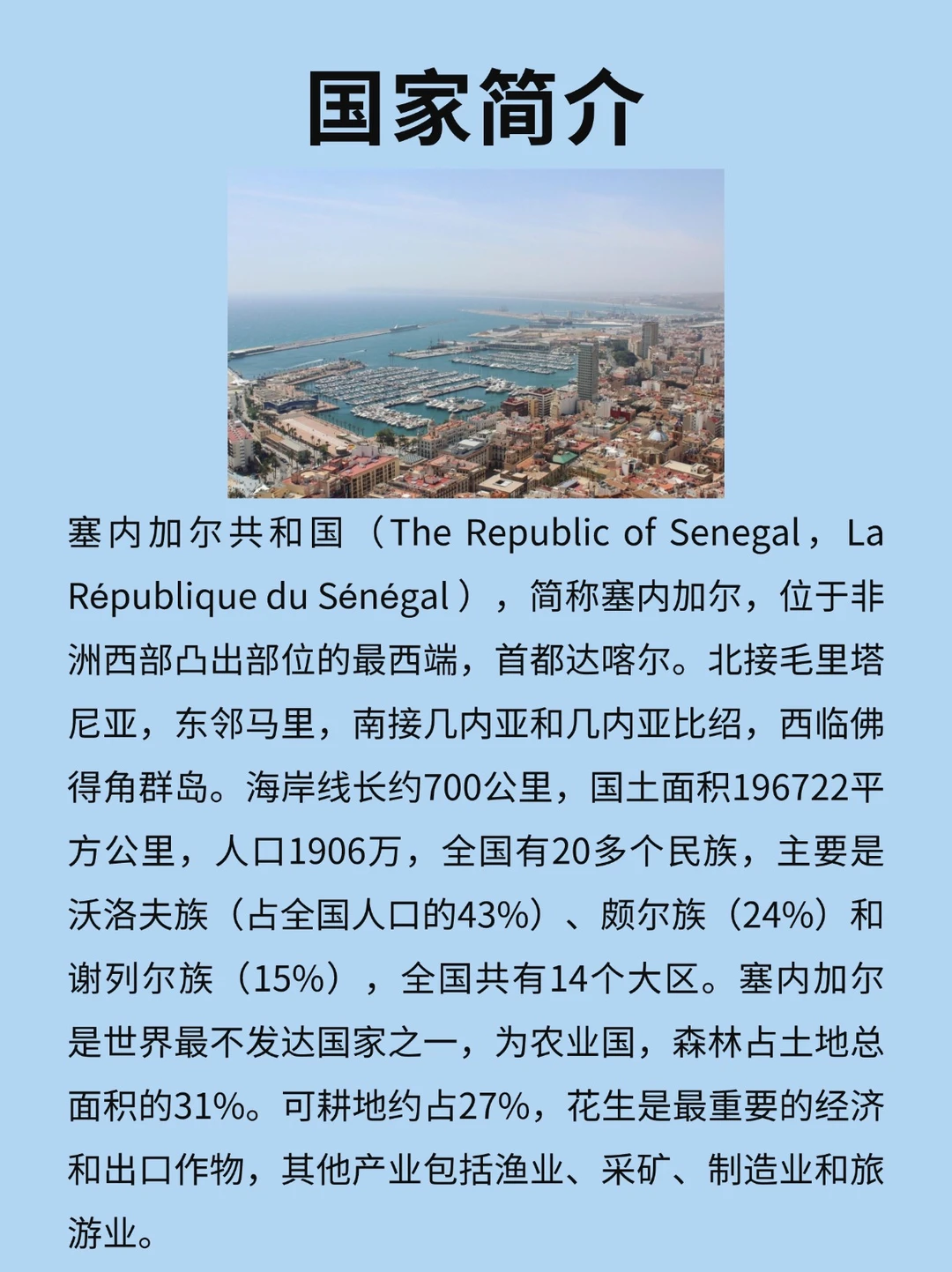 塞内加尔共和国(The Republic of Senegal,La République du Sénégal ),简称塞内加尔,位于非洲西部凸出部位的最西端,首都达喀尔。 [私信R]北接毛里塔尼亚,东邻马里,南接几内亚和几内亚比绍,西临佛得角群岛。 [打卡R]海岸线长约700公里,国土面积196722平方公里,人口1906万,全国有20多个民族,主要是沃洛夫族(占全国人口的43%)、颇尔族(24%)和谢列尔族(15%),全国共有14个大区。 [开箱R]塞内加尔是世界最不发达国家之一,为农业国,森林占土地总面积的31%。可耕地约占27%,花生是最重要的经济和出口作物,其他产业包括渔业、采矿、制造业和旅游业。 —