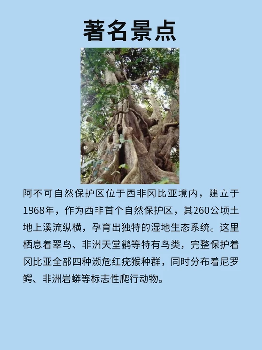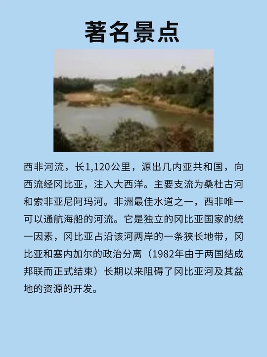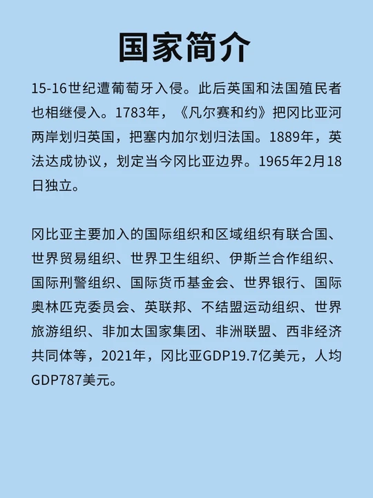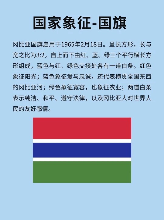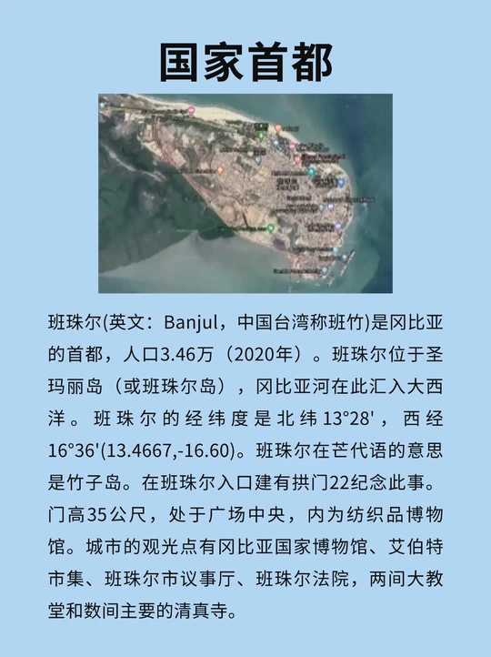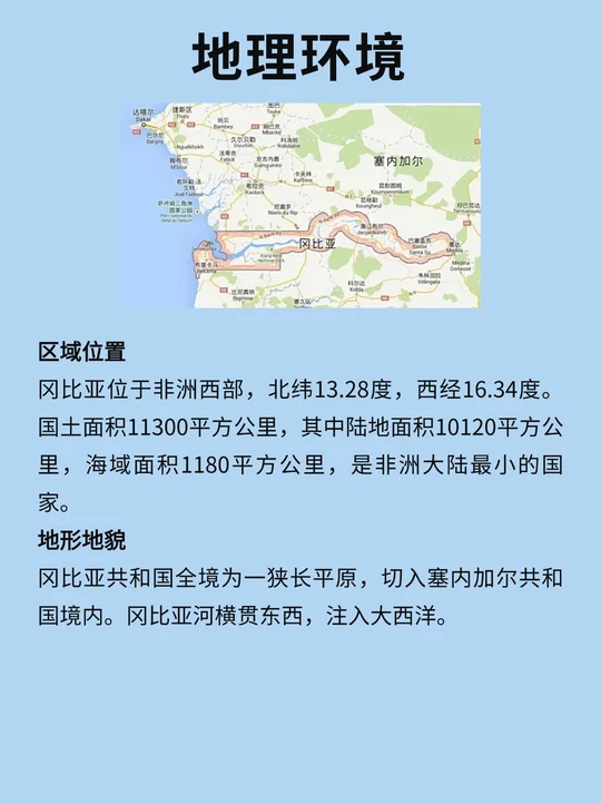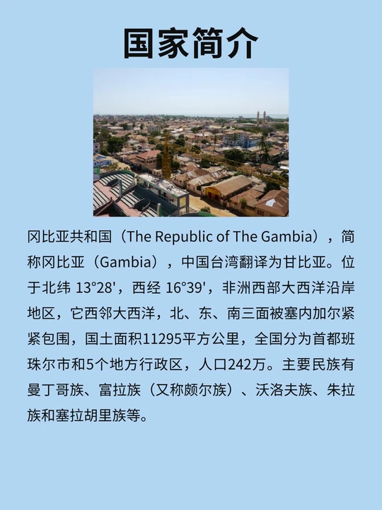 [打卡R]冈比亚共和国(The Republic of The Gambia),简称冈比亚(Gambia),中国台湾翻译为甘比亚。 [私信R]位于北纬 13°28',西经 16°39',非洲西部大西洋沿岸地区,它西邻大西洋,北、东、南三面被塞内加尔紧紧包围,国土面积11295平方公里,全国分为首都班珠尔市和5个地方行政区,人口242万。 主要民族有曼丁哥族、富拉族(又称颇尔族)、沃洛夫族、朱拉族和塞拉胡里族等。 -