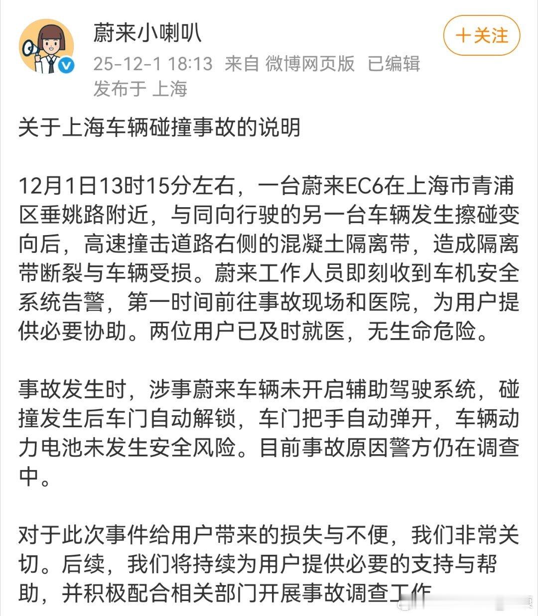 蔚来上海事故,官方说明划了两个重点。1、未开启辅助驾驶系统2、车门把手自动弹开现在都把这两个项目当成衡量标准了吗