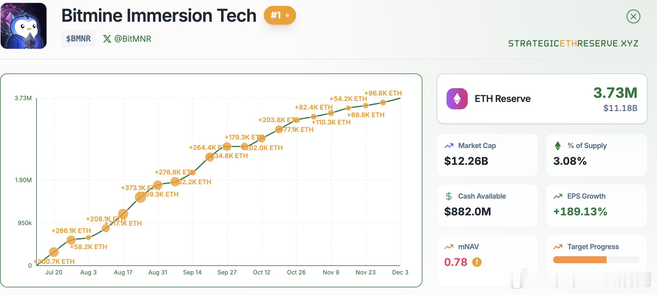 关注二饼的同学可以看下最近虽然二饼大幅下跌但是作为二饼届的微策略:Bitmine,一直在坚定不移的践行自己的承诺一直不停的买,买完就喊单,喊完继续买,从始至终没有卖出过一次Bitmine 已经成为最大的二饼持有者之一并且现在距离他们的购买总量5%的目标已经完成了61.16%但现在问题是,他们的平均成本为 3960 美元,现在也大概面临 31%的回撤Tom Lee 也说了,他自己根本不虚,他预测二饼将在26年1月达到7000