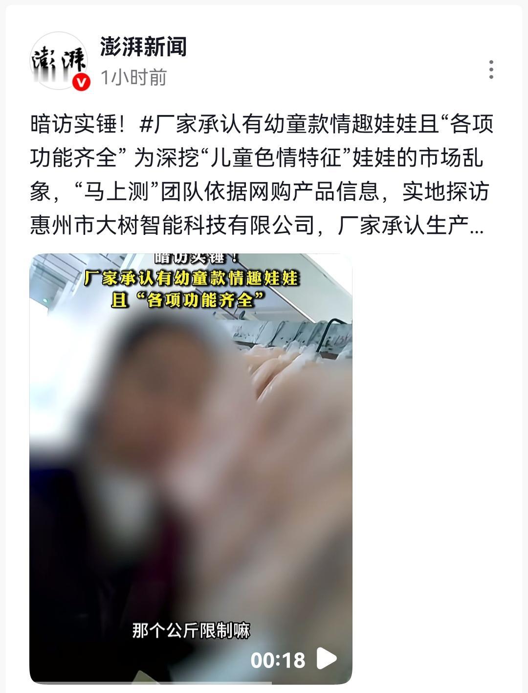 把幼女娃娃披上“手办”的皮!刷到澎湃新闻的暗访,我生理性不适,你敢信吗?电商平台上标着BJD等身手办、二次元萝莉人偶的商品,点进去是仿幼女体型的硅胶情趣娃娃。商家把幼童体态、未发育身体包装成可爱款,还拿关节可动、二次元当遮羞布。工厂更直白,记者暗访惠州那家大树智能科技时,人家直接说幼童款功能齐全,能定制身高,这是手办吗?这不就是把儿童形象性化、物化,专门喂给恋童癖的定制商品。 当儿童的身体被做成性化商品流通,其实是在给儿童可以被物化的扭曲观念铺路,今天是娃娃,明天会不会有人把这种偏好伸向真实的孩子? 更恶心的是平台的装瞎,幼女款、萝莉软体这些词都快把“擦边”写脸上了,算法审核是摆设?为了流量就放任这种踩伦理红线的商品卖? 恋童癖的欲望不该被合法化,儿童的形象更不该成生意,今天放这种脏东西一马,明天遭殃的,可能是真的孩子。希望刷到的朋友都能抵制这种不良商品!