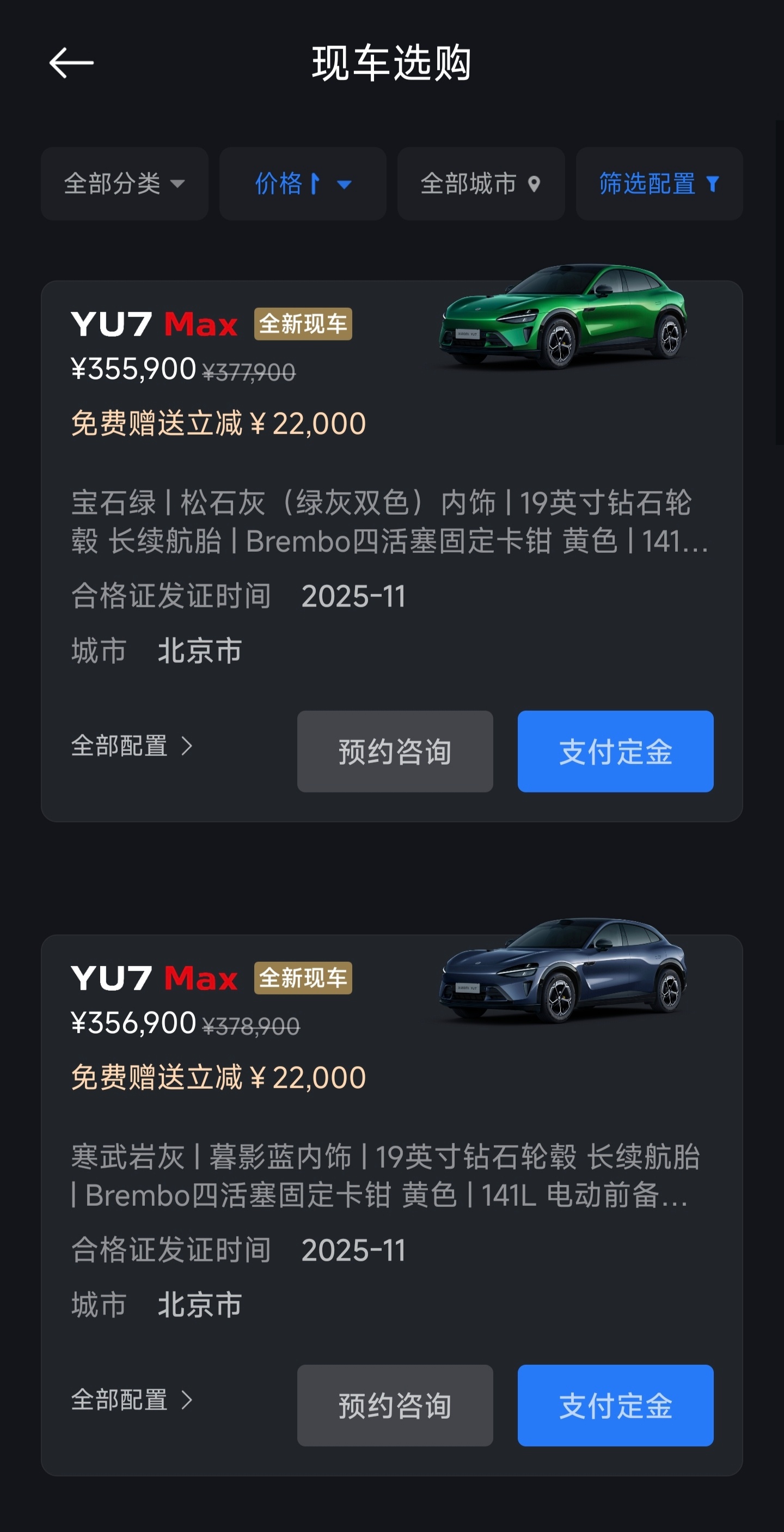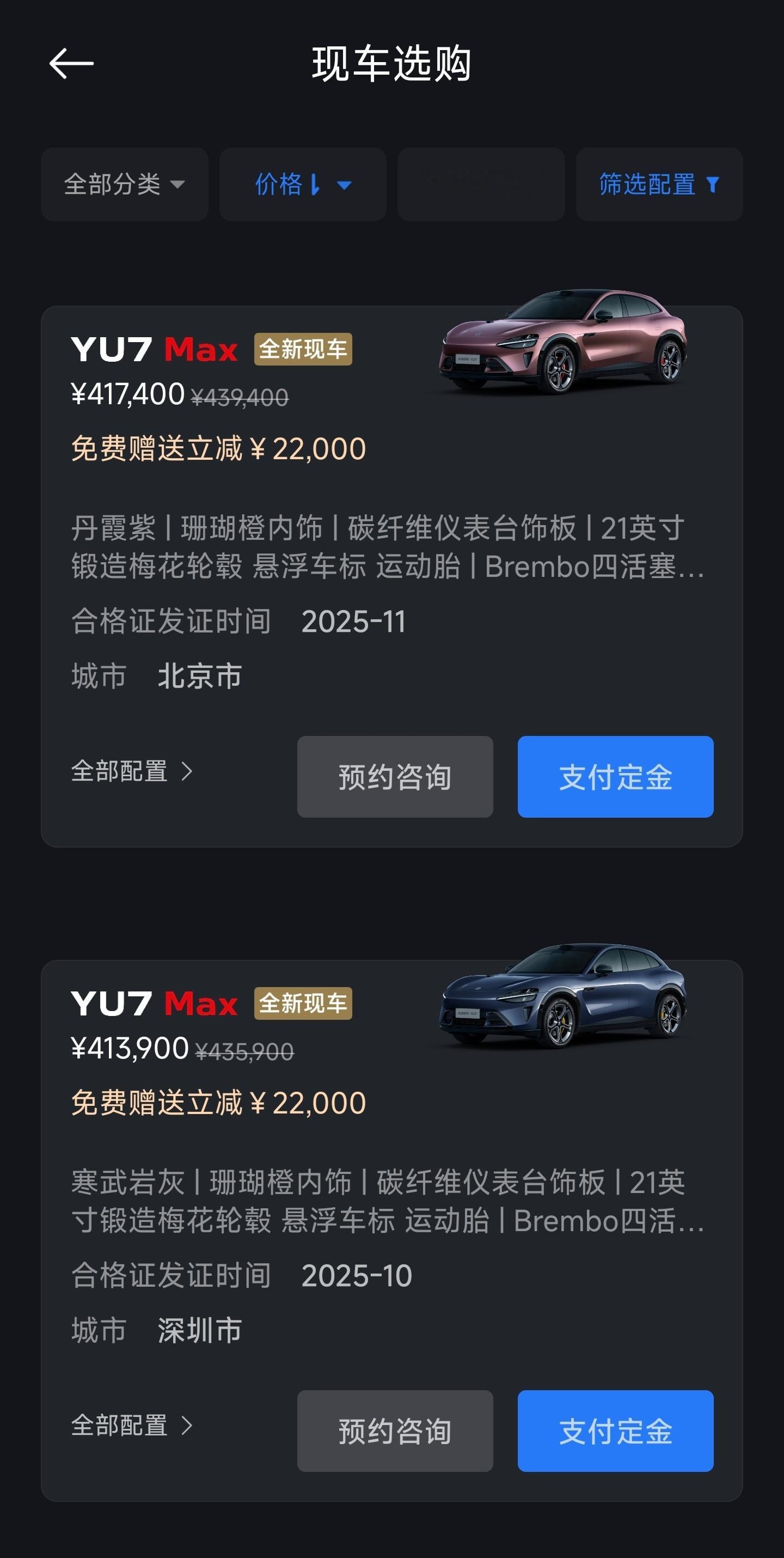看了一下小米的「现车选购」,展车已经全部卖完了,剩下的都是全新现车。目前SU7有Pro和Max,YU7只有Max版本。YU7选的配置都特别高,最便宜的一台是35.59万,最贵的已经来到了41.74万,并且大量现车都在40万以上。要知道YU7 Max的起售价只有32.99万,这个选配的金额确实挺夸张。过年前想开上小米YU7的机会来了