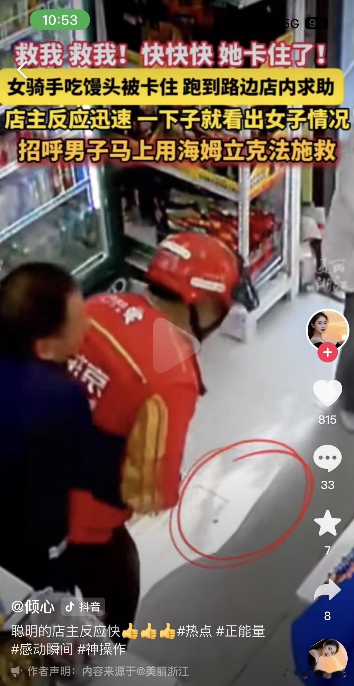 “救我!救我!”近日,湖北红安一路边商店里,忽然跑进来一位外卖女骑手,她满脸通红,喉咙里发出含糊的求救声,“救我!” 女店主正忙着应付其他顾客,被这眼前突然出现的一幕吓了一跳:只见衣着臃肿的外卖女骑手,一边含混不清地喊着救我,一边指着自己的喉咙。店里的顾客也都停下动作看过来,有人下意识往后退了两步,有人掏出手机却不知道该先拍还是先打120,乱糟糟的空气里满是慌张。女店主定了定神,一眼就看出是呛到东西了——那骑手的脸已经从通红慢慢泛紫,双手死死掐着脖子,嘴角还溢着没咽下去的食物残渣,站都快站不稳了。 女店主之前在社区讲座上学过两招海姆立克急救法,这会儿也顾不上多想,赶紧冲过去绕到骑手身后,让旁边的顾客帮忙扶住她前倾的身体。双手环住骑手臃肿的外套,摸到肚脐上方两横指的位置,一手握拳抵在那里,另一手包住拳头使劲向上向内冲击。一下、两下,骑手喉咙里发出更剧烈的含糊声响,脸色还是没好转,女店主手心冒着凉汗,手上的力气却没敢减,心里只记着老师说的,窒息黄金四分钟,晚一秒都可能出大事。 第五下冲击下去的时候,骑手突然剧烈咳嗽起来,一口没嚼烂的馒头块从嘴里喷了出来,紧接着就大口大口喘着气,脸色慢慢褪去青紫,眼神也清明了些。女店主松了口气,腿都有点发软,扶着骑手坐到门口的凳子上,递过温水让她慢慢喝。缓过来的骑手声音还沙哑着,说自己是趁着等餐的间隙啃了两口馒头,想着赶紧送完下一单,没嚼碎就往下咽,一下子卡在了喉咙里,慌得她骑着车就往最近的商店冲,幸好遇到了懂急救的店主。 这事看着惊险,其实藏着挺多值得琢磨的地方。现在街上的外卖骑手越来越多,风里来雨里去的,为了多接几单,吃饭喝水都跟赶时间赛跑,狼吞虎咽成了常态,也就容易出这种意外。更让人揪心的是,要是当时店里没人懂急救知识,就算及时打了120,等救护车来可能也错过了最佳抢救时间。之前就听过不少类似的事,有人吃东西呛到,身边人只会拍背催吐,反而让异物卡得更紧,最后耽误了救治。 我之前在小区里也见过骑手匆匆忙忙的样子,天刚亮就戴着头盔往外跑,深夜还能看到他们车灯的光亮。总有人说骑手逆行闯红灯不守规矩,可很少有人想过,他们背后是平台催单的压力,是想多挣点钱的生计。就像这位女骑手,不过是想抓紧时间吃口饭,却差点酿成悲剧。这不是某一个人的问题,是整个行业节奏太快,快到让人连好好吃饭的时间都没有,也快到大家都忘了学些基础的急救知识,万一遇到意外只能手足无措。 好在这次有惊无险,女店主的果断救了人,也给在场的人上了一课。其实基础急救技能真该人人都学一点,不用多复杂,哪怕就会个海姆立克、懂点心肺复苏,关键时候就能帮别人一把。对骑手们来说,也该多顾着点自己的身体,挣再多钱也得有命花,慢一点吃饭,慢一点赶路,比什么都重要。平台也该多给点包容,别把配送时间卡得那么死,少点罚款多点体谅,让这些奔波的人能有喘口气的空间。 一场意外,既是幸运的救赎,也是无声的提醒。我们总在追求速度和效率,却常常忽略了生命里最基本的安全和从容。愿每个为生活奔波的人都能被温柔以待,也愿每个人都能多学些急救技能,在关键时刻既能保护自己,也能照亮别人。各位读者你们怎么看?欢迎在评论区讨论。