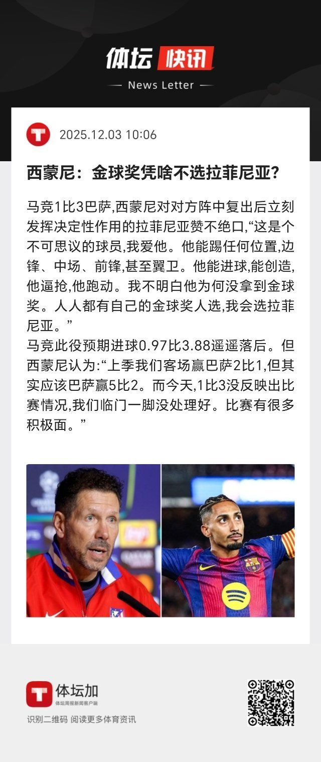 西蒙尼:人人都有自己的金球奖人选,我会选拉菲尼亚。