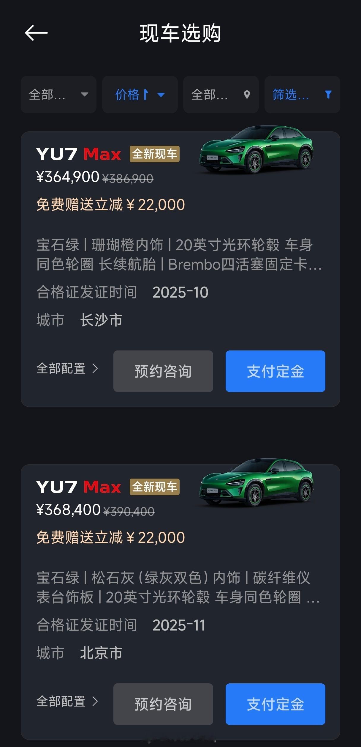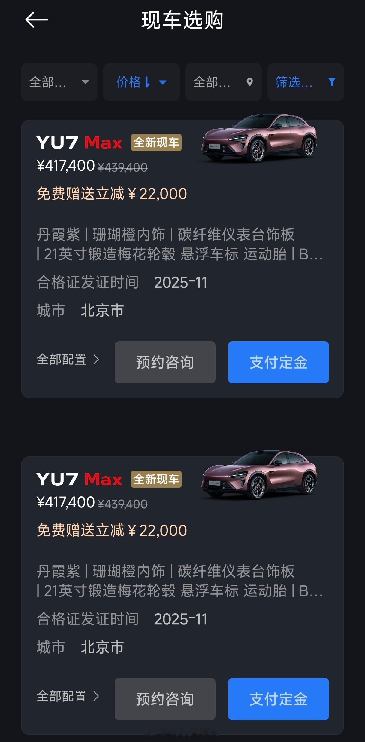 有些人在硬黑,其实小米的现车总共不到500辆,也不是很多,现车的原因就是有的选配了很多又不提车,和很多订单待交付不矛盾。YU7的现车,全是Max版本,最贵选到了43.94万,最便宜的也是38.69万后面对这种选配得有对策才行,要不然类似情况继续,明显影响生产和交付