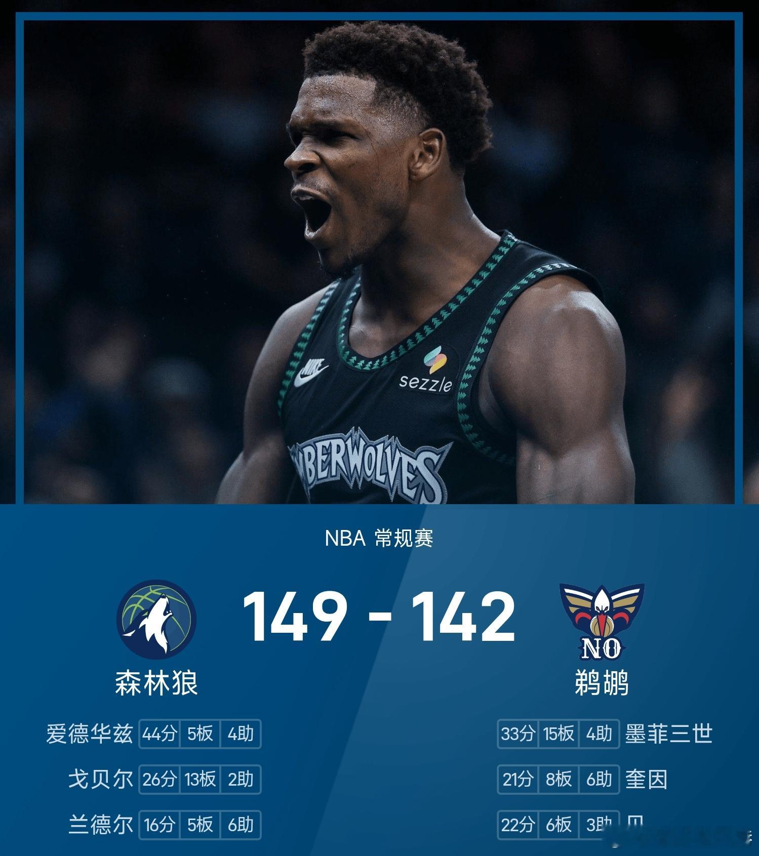 森林狼vs鹈鹕鹈鹕142-149不敌森林狼。爱德华兹砍下全场最高的44分5板4
