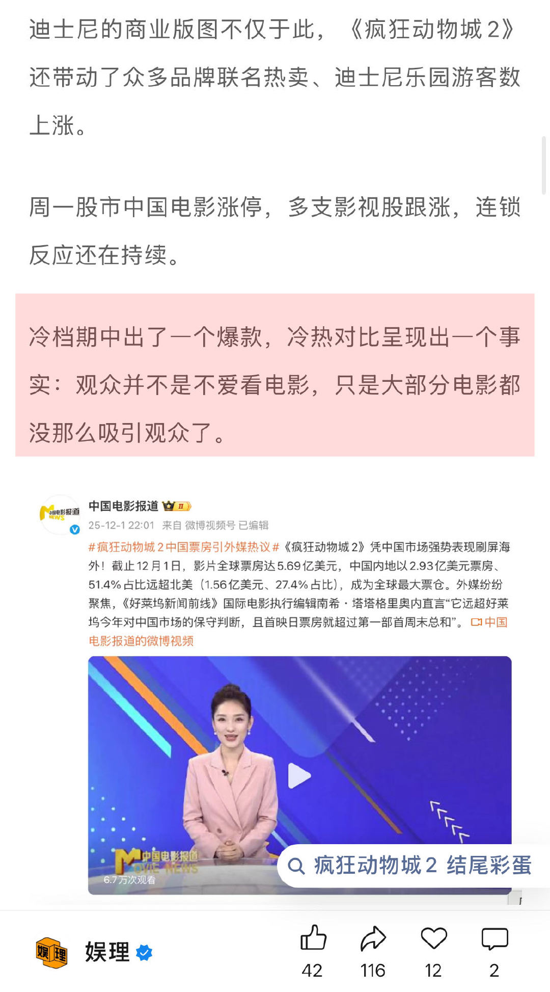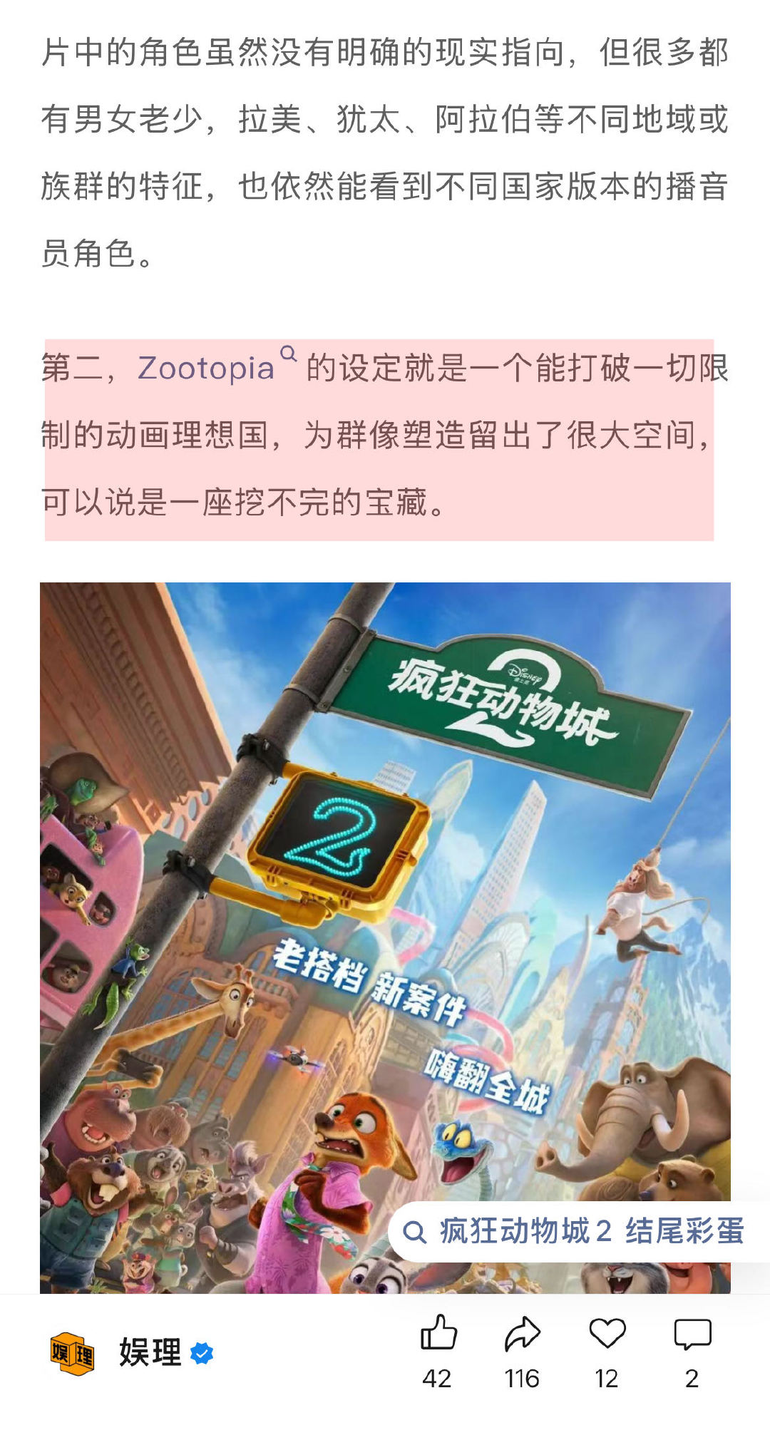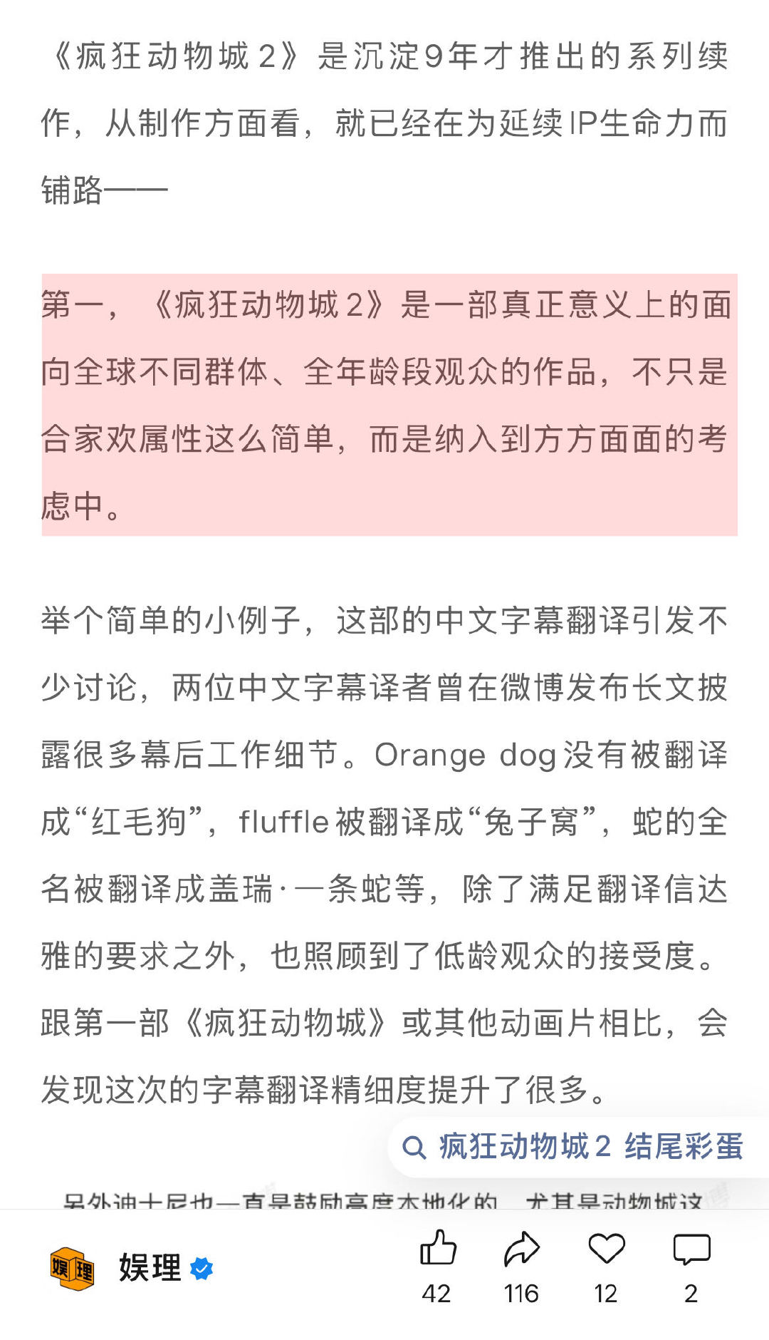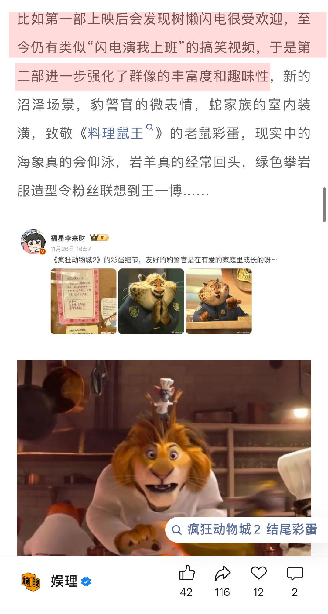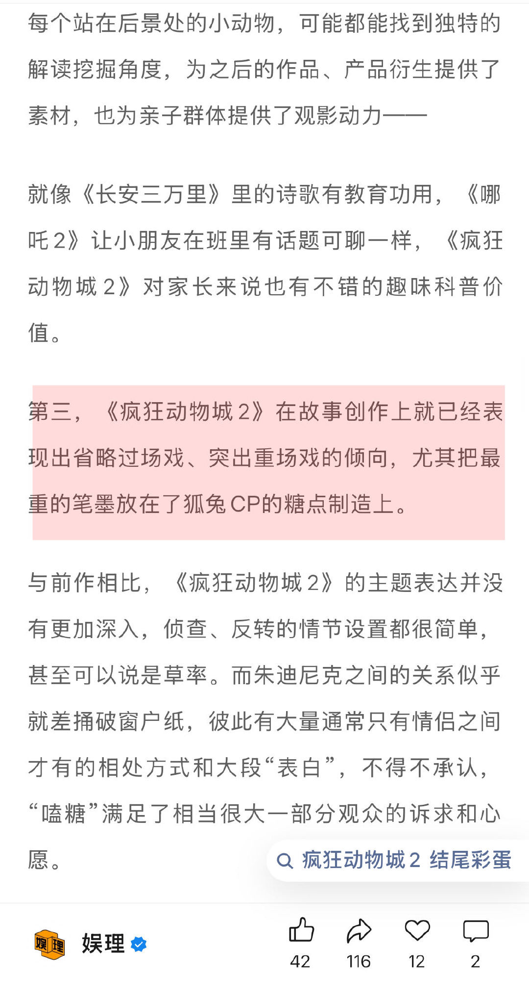 疯狂动物城2周边卖爆 为什么疯狂动物城2能救市 在看来,《疯狂动物城2》爆卖主要有三点:这部电影是一部真正意义上的面向全球不同群体、全年龄段观众的作品;Zootopia的设定是能打破一切限制的动画理想国,为群像塑造留出了很大空间;在故事创作上已经表现出省略过场戏、突出重场戏的倾向,尤其把最重的笔墨放在了狐兔CP的糖点制造上…娱理独家↓
