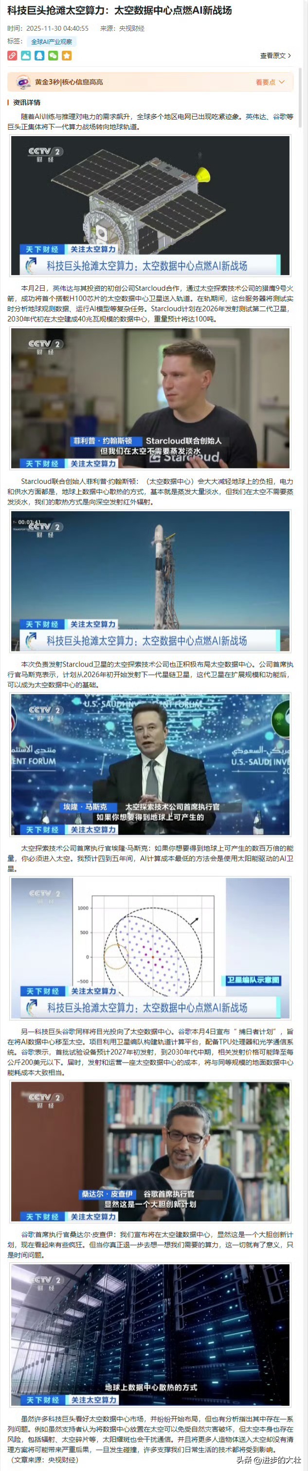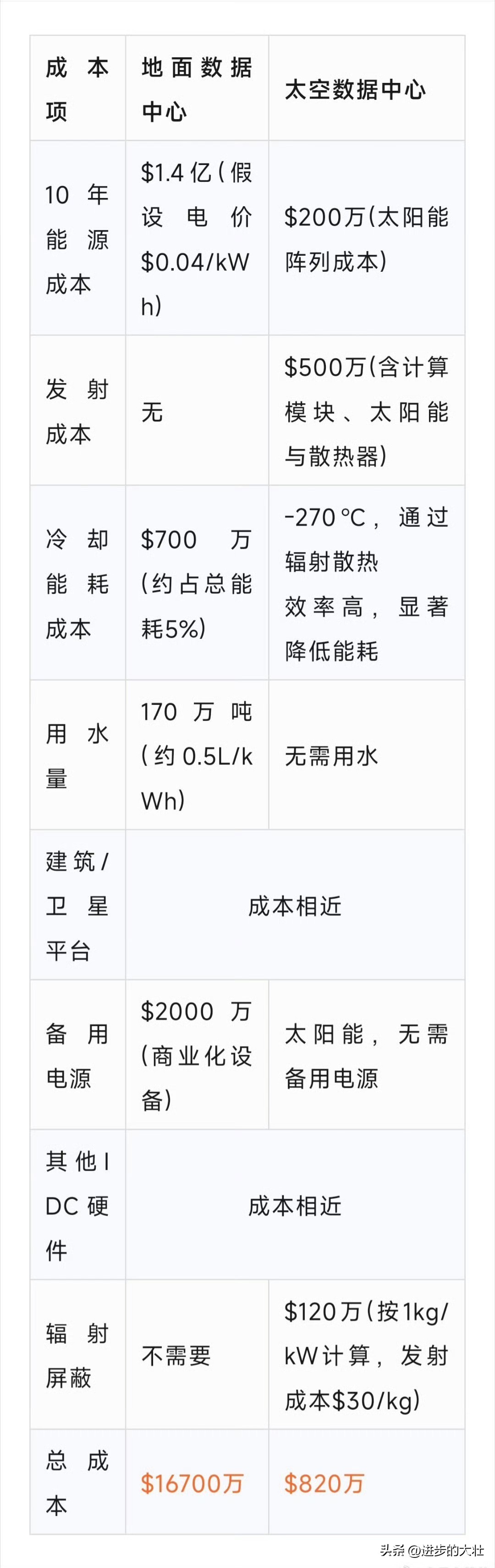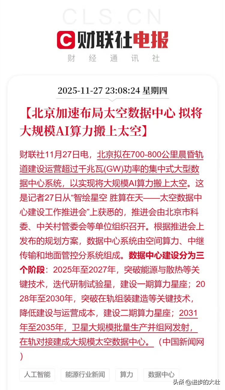 中国要把大规模数据中心搬上太空,在太空布局AI算力! AI算力和数据中心的尽头就是电力,太空有取之不尽24小时在线的太阳能,光伏板一架,电力哗哗就来。 建在太空还有个好处,不用考虑散热,太空的-270度低温环境就是天然散热场。 十年运营成本算下来,在太空建设算力数据中心,只有地面的百分之五,未来数据工程师要上天。 这个赛道,只有中美两国竞争,其他国家想都没敢想。 美国的科技大佬马斯克才刚提了这么个想法,中国已经在用“智绘星空”计划推进了。