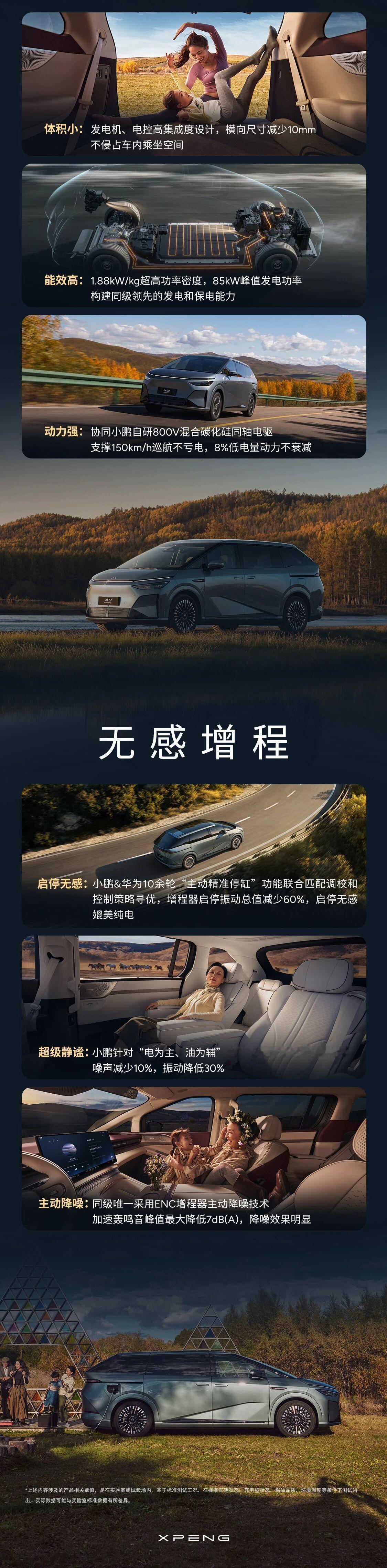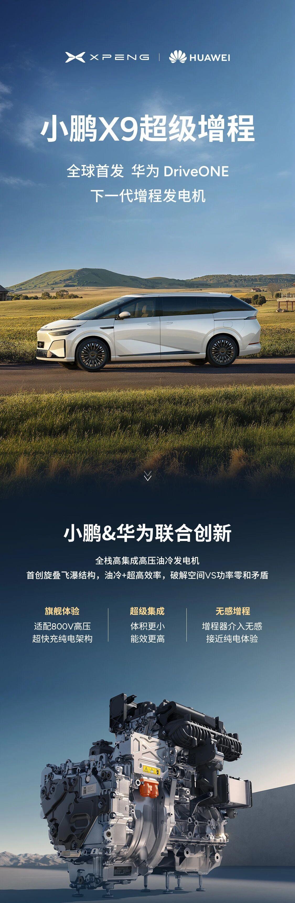 小鹏&华为,这两个牌子放在一起的时候,总会让人好奇到底是什么事。这次不是AR-HUD的合作,而是增程发电机合作。小鹏X9超级增程版全球首发搭载华为DriveONE全栈高集成高压油冷发电机。没想到吧,华为DriveONE也有增程发电机,而且也开始外供给合作伙伴。小鹏之所以会选择华为DriveOne增程发电机,是因为它的性能表现非常出色。其持续功率密度达到1.88kW/kg,工况发电效率不低于92%。通过应用多冲片齿部喷油及冷却技术,该发电机在实现轻量化和小型化的同时,提供了85kW的最大发电功率和75kW的持续发电功率。而这一次X9超级增程的合作,可不仅仅是采购关系。双方针对小鹏X9“大七座”车型的特定需求,在研发过程中重点解决了四个方面的工程挑战:空间集成:通过高集成设计将发电机尺寸压缩,结合小鹏的一体压铸技术,优化了前舱空间利用率。续航效率:依托小鹏的高压纯电架构与华为的高效发电系统,整车实现了1602km的综合续航里程及较低的油耗水平。动力保持:系统支持在150km/h高速巡航状态下保持电量平衡,并在8%低电量(SOC)下维持动力输出不衰减。静谧体验:通过联合调校的主动停缸技术和控制策略,大幅降低了增程器启停时的振动与噪音,将介入噪音控制在0.5dB以内。除了X9超级增程,小鹏的后续增程车型也会选择华为DriveOne增程发电机,双方通过联合研发,来继续提升增程车型在长续航、强动力及静谧性方面的综合体验。小鹏X9联手华为推出下一代增程发电机