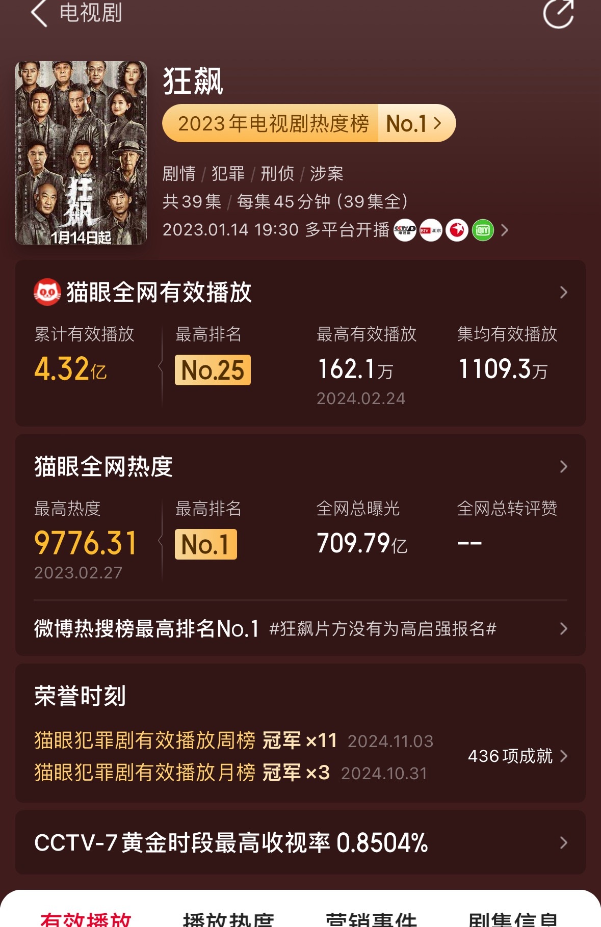知不知道大爆剧狂飙,猫眼集均只有1100万啊?云合集均可是差不多1.8亿哦。