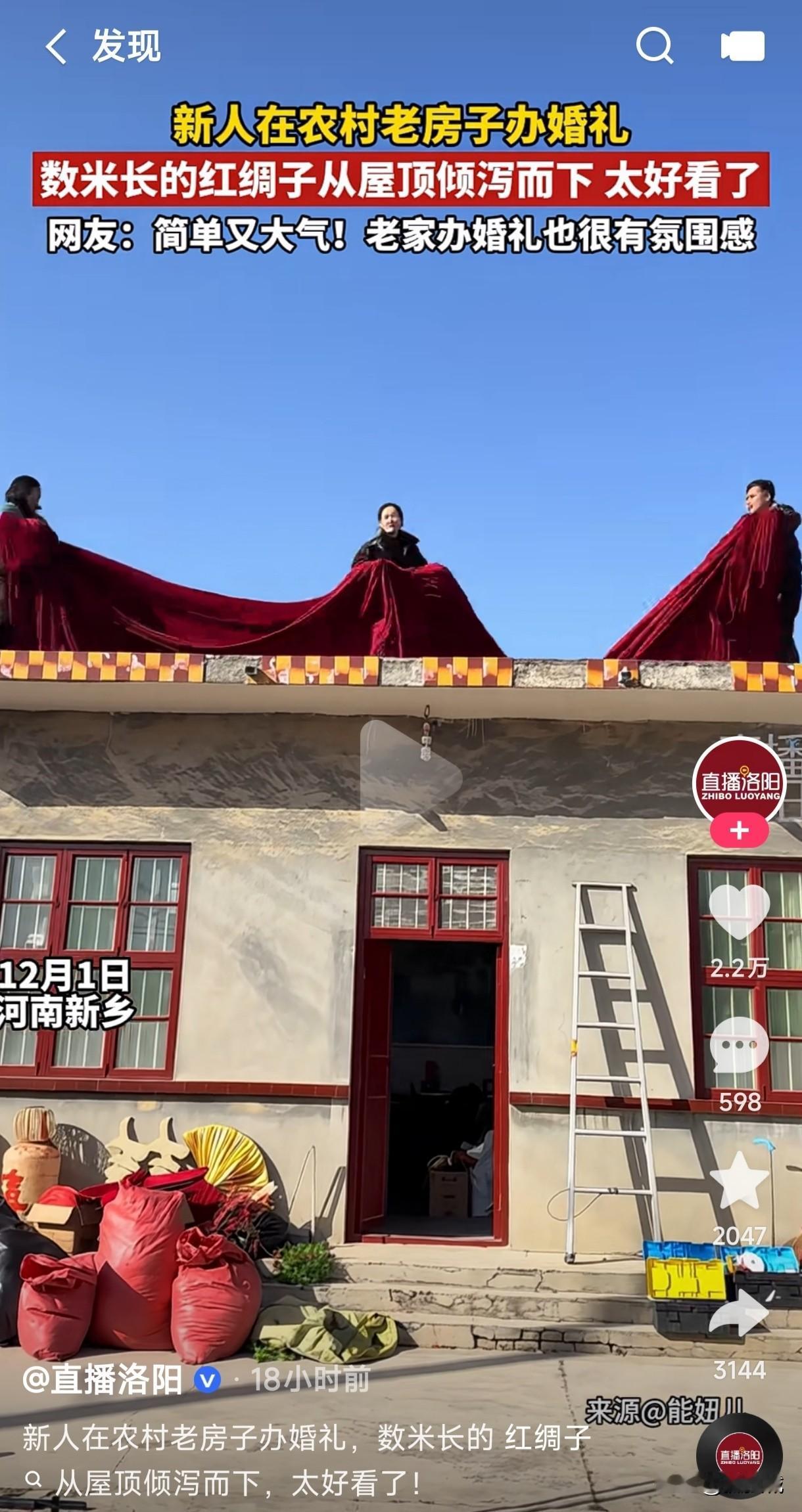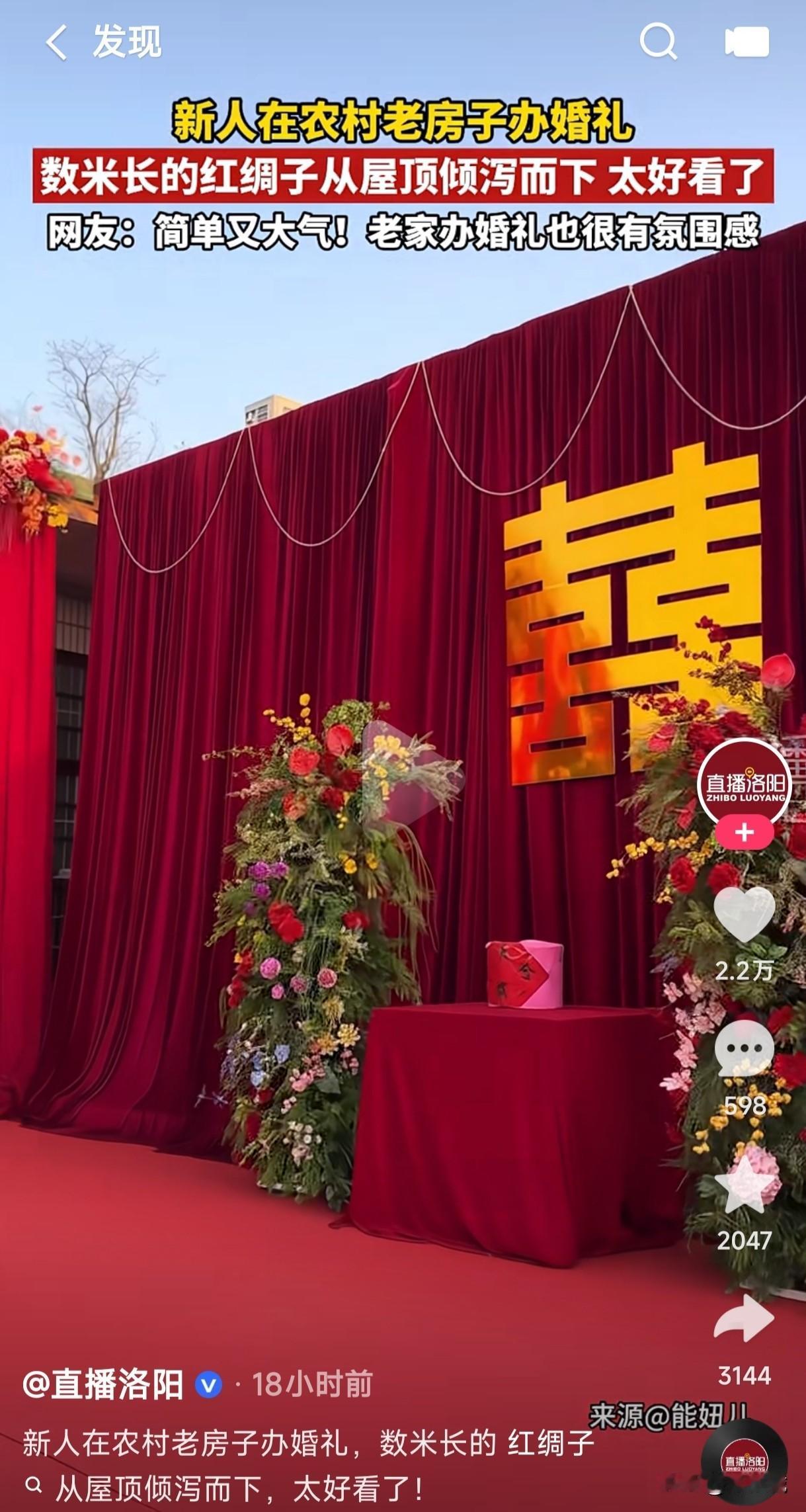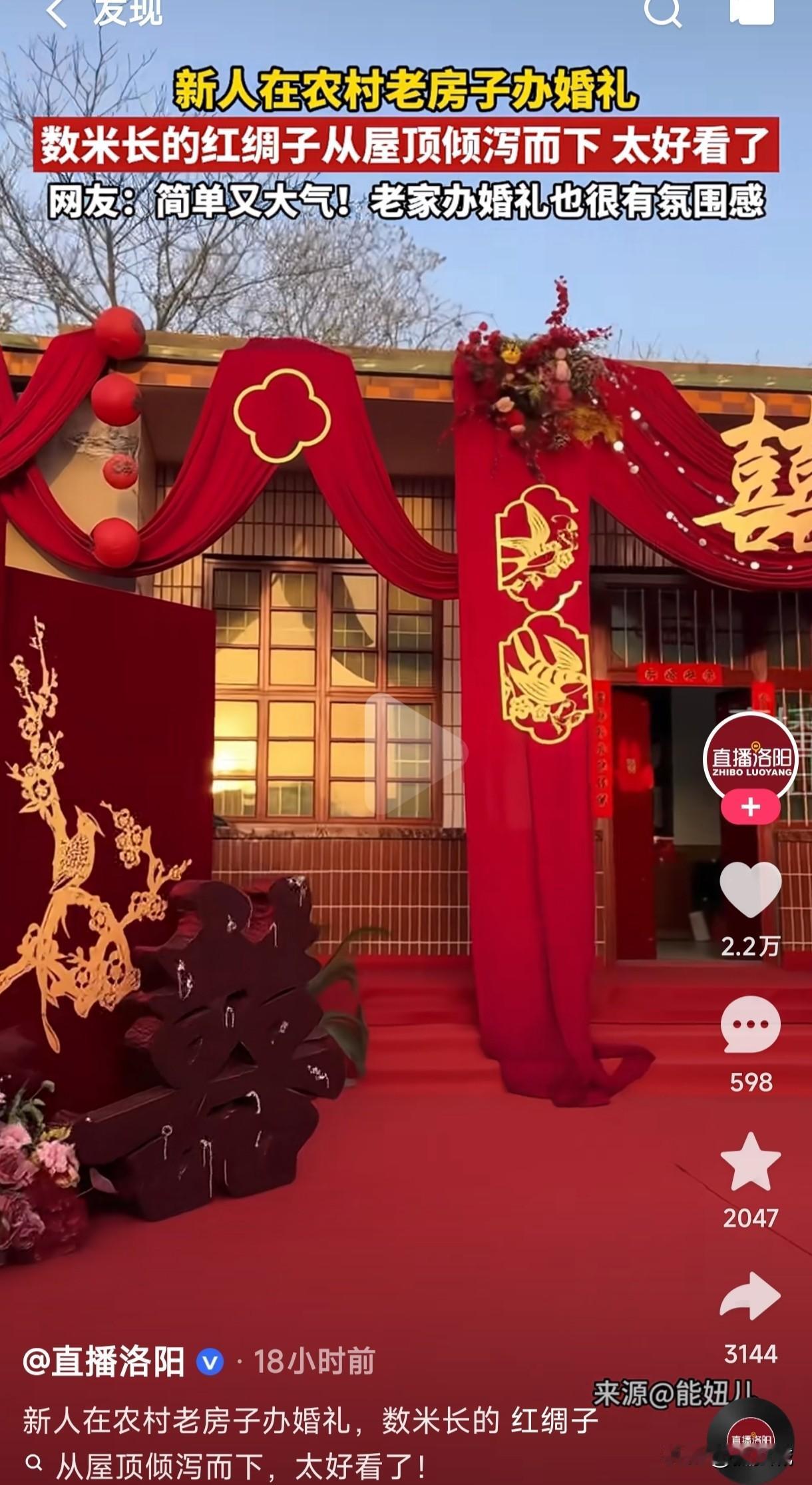 农村老房子的婚礼布置氛围感并不比酒店场地的氛围感差,数米长的红绸子从屋顶倾泻而下,是不是很漂亮? 只要有惊人的想法,就没有布置不出自己想要的效果,谁能想到农村老房子也能布置出像酒店场地一样的喜庆氛围,并且价格还是相当的便宜,酒店需要好几万的费用在农村老房子只需要几千块钱就解决了,这样下来是不是省事多了,只需要数米长的红布从房顶倾泄而下就可以了,简单又大气的农村婚礼布置是不是喜庆感十足?这样的氛围感是不是赛过酒店的场地了?