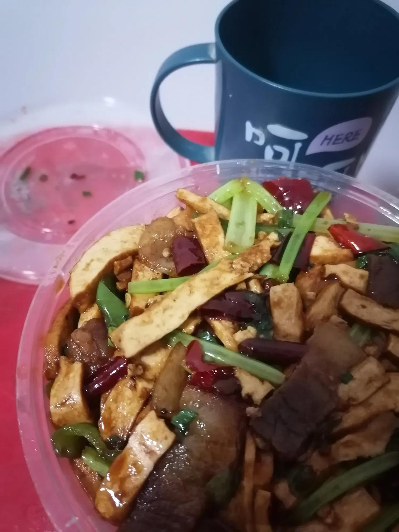 大家好。我是水电工星仔,干一天活回来,手也冷,脚也冷,那就吃点好的吧! 今天的晚饭,香干回锅肉,牛栏山半杯。 香干特意让老板加了辣,牛栏山是昨天买的,今天见了底。 这一天伙食费竟高达31元,就问你奢不奢侈,做水电工靠不靠谱。 等会儿,希望自己争点气,尿尿别摔在厕所,地板怪冷的,受了凉,明天上不了工,又少一天的工钱!