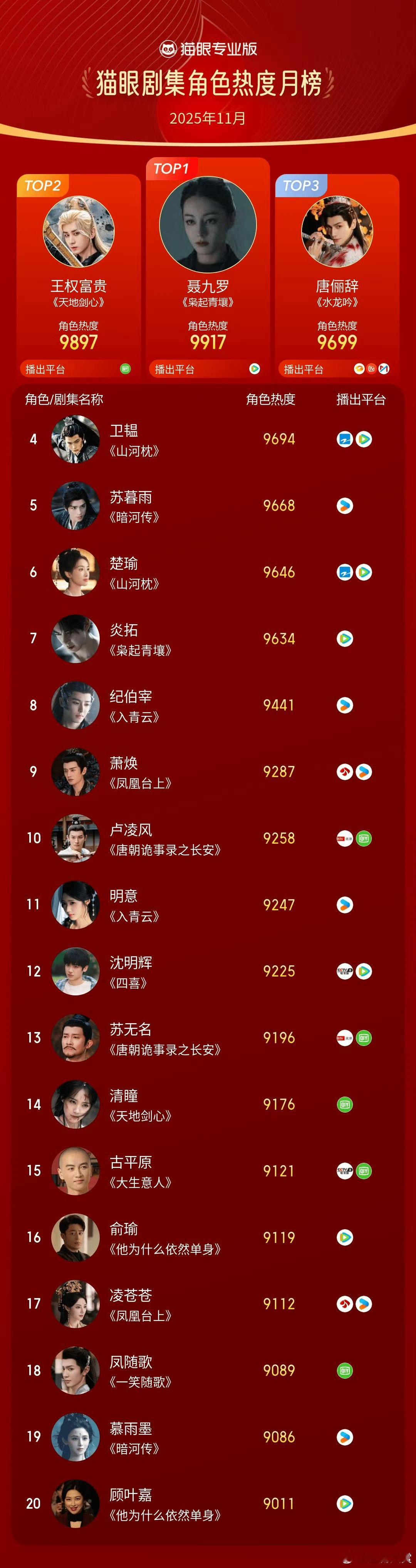 11月猫眼角色热度榜单,迪丽热巴聂九罗猫眼角色热度9917,成为11月top1,不愧是我们聂九罗!