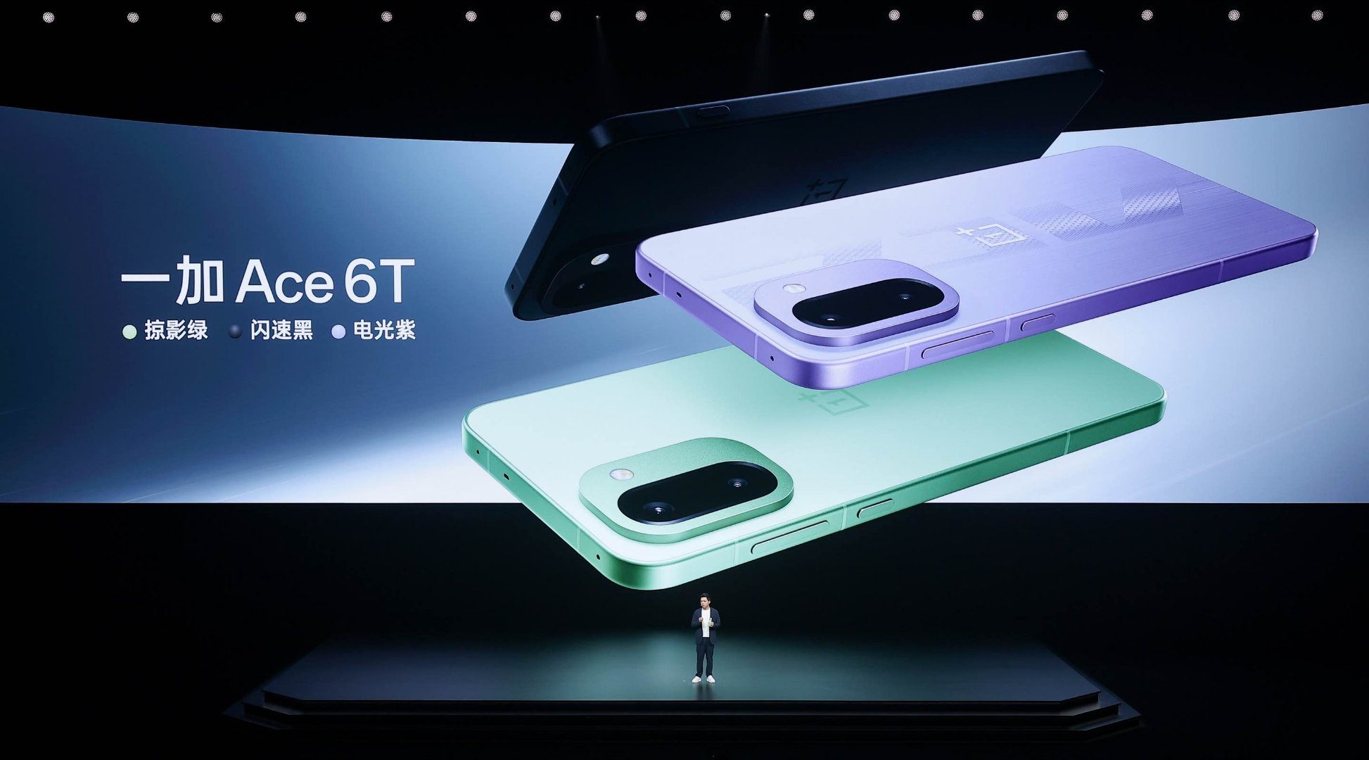 一加Ace6T 有「掠影绿」、「电光紫」、「闪速黑」三款配色,延续简洁的设计风格,以Colorful Design多彩美学设计呈现全面旗舰质感。而且整机背板干净清爽,金属魔方Deco精致好看,搭配圆润的“黄金R角”与高强度微弧金属中框,尽显秩序美学的同时,实现舒适的握持体验与轻盈坚固的质感。正面采用超窄边设计,视野超沉浸,⼤屏更尽兴;更有全新升级快捷键,新增九大功能,自由定义,方便好用。一加Ace6T新品发布
