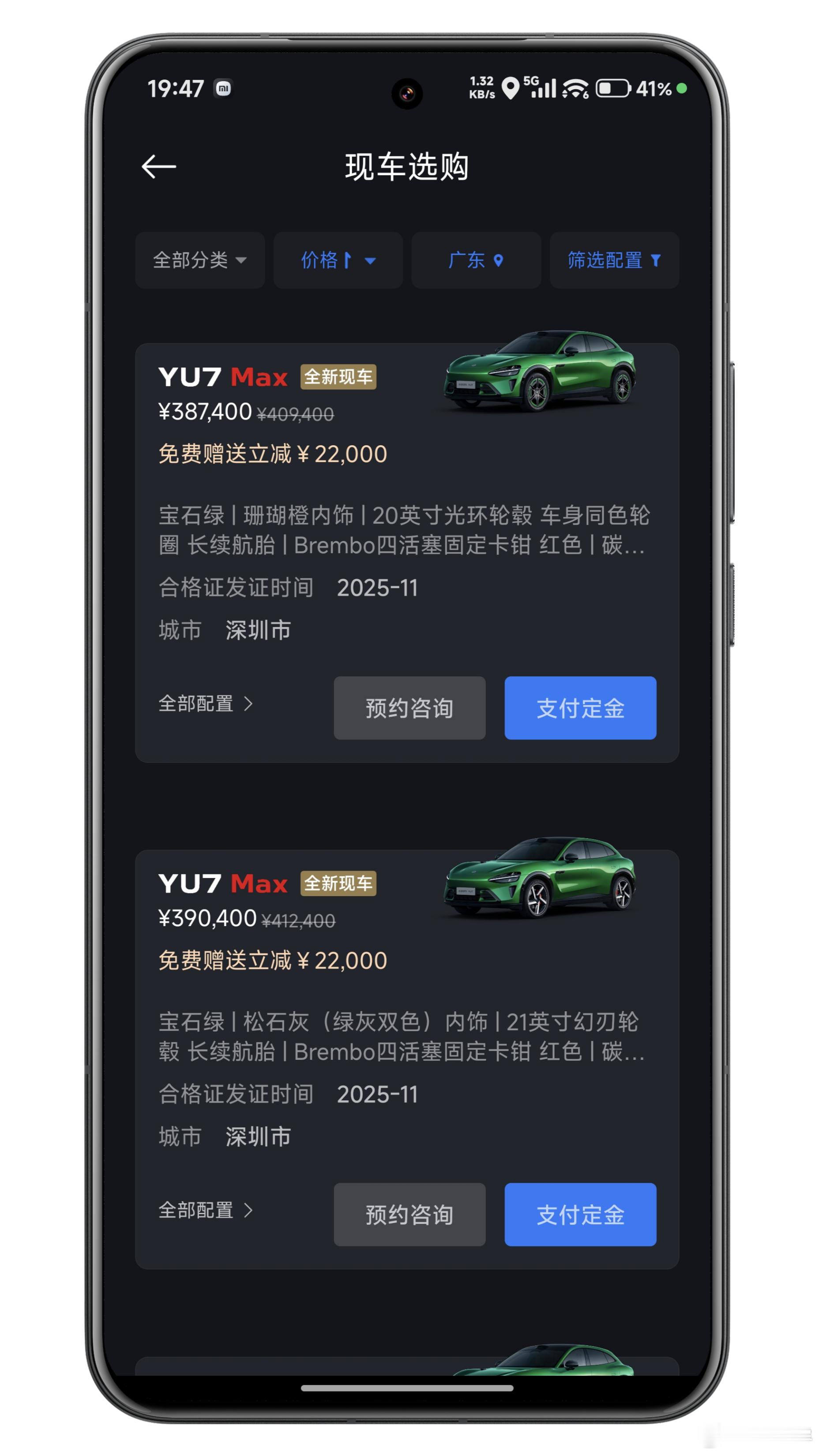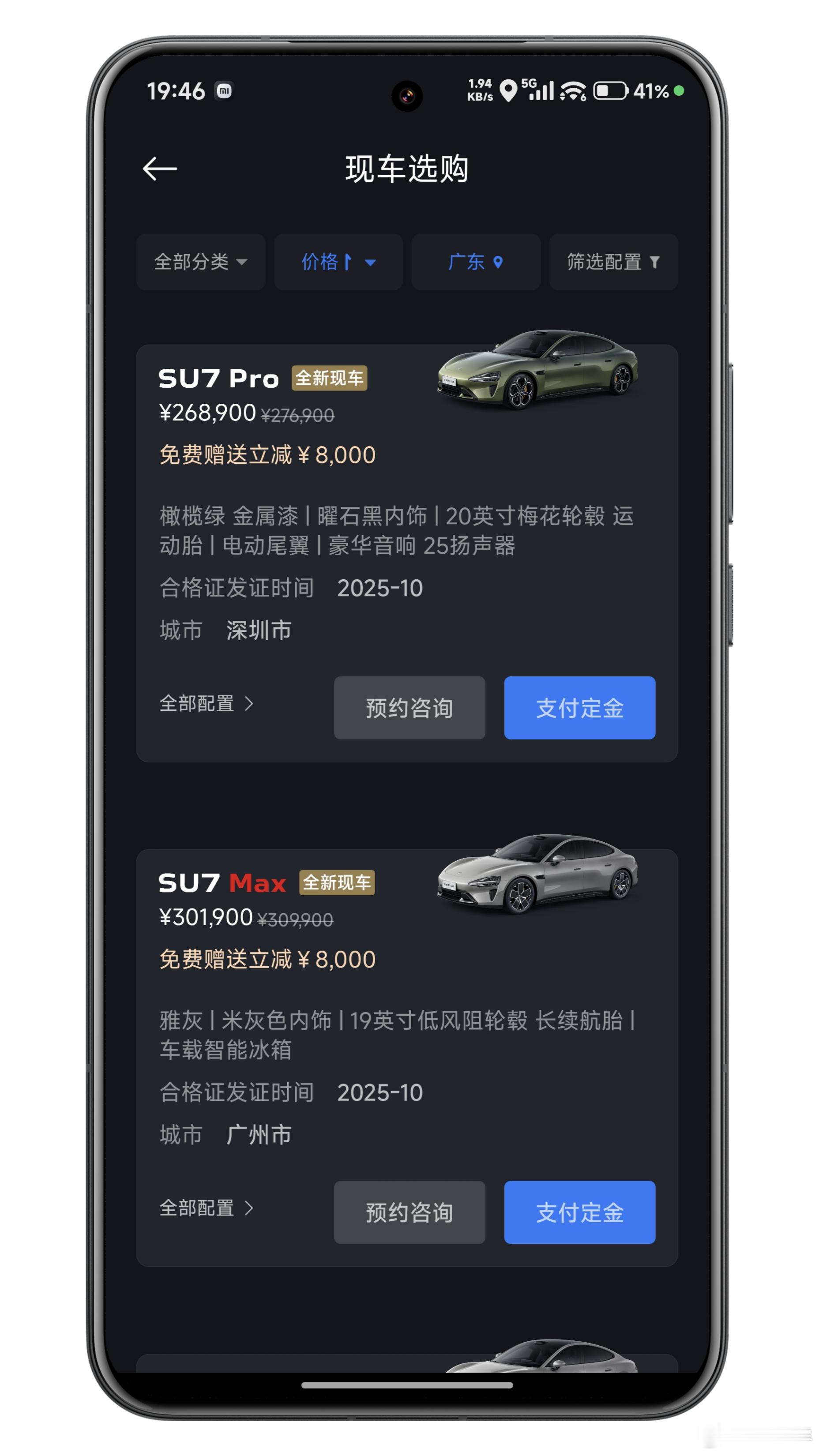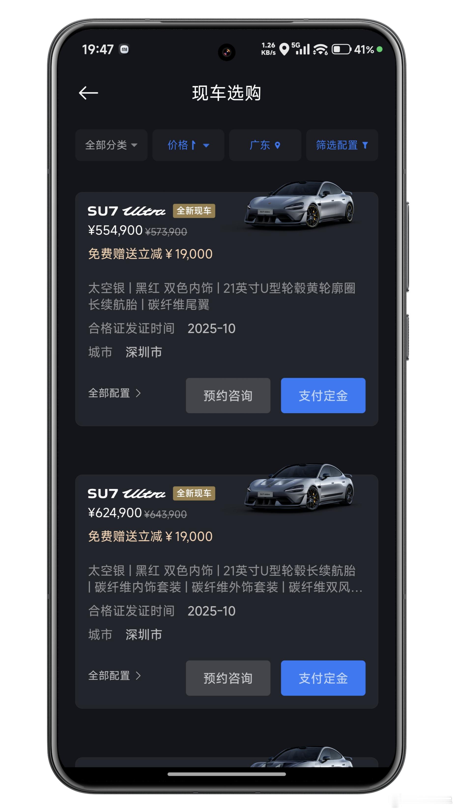 小米现车已面向全部用户开放选购,年底前可提车我登上去看了,广东全省只剩一台 26.9 万的 SU7 Pro,其他全是 30W+ 的 SU7 Max / Ultra 和 YU7 Max而且剩下的现车很多都选装了一堆配置,价格挺高所以这些现车其实没大折扣,主要意义是快速提车好奇抢到的朋友都选了什么配置的?