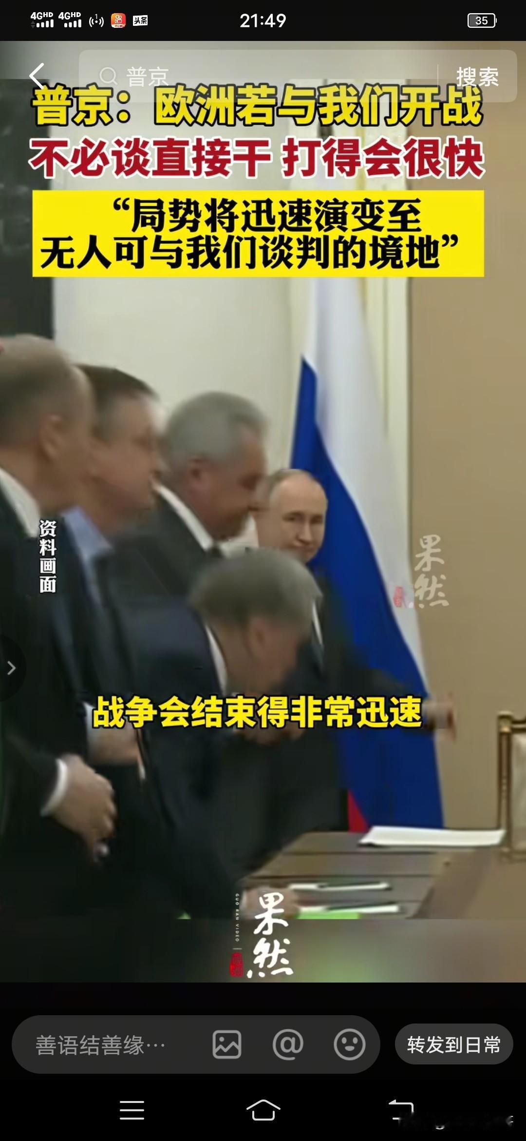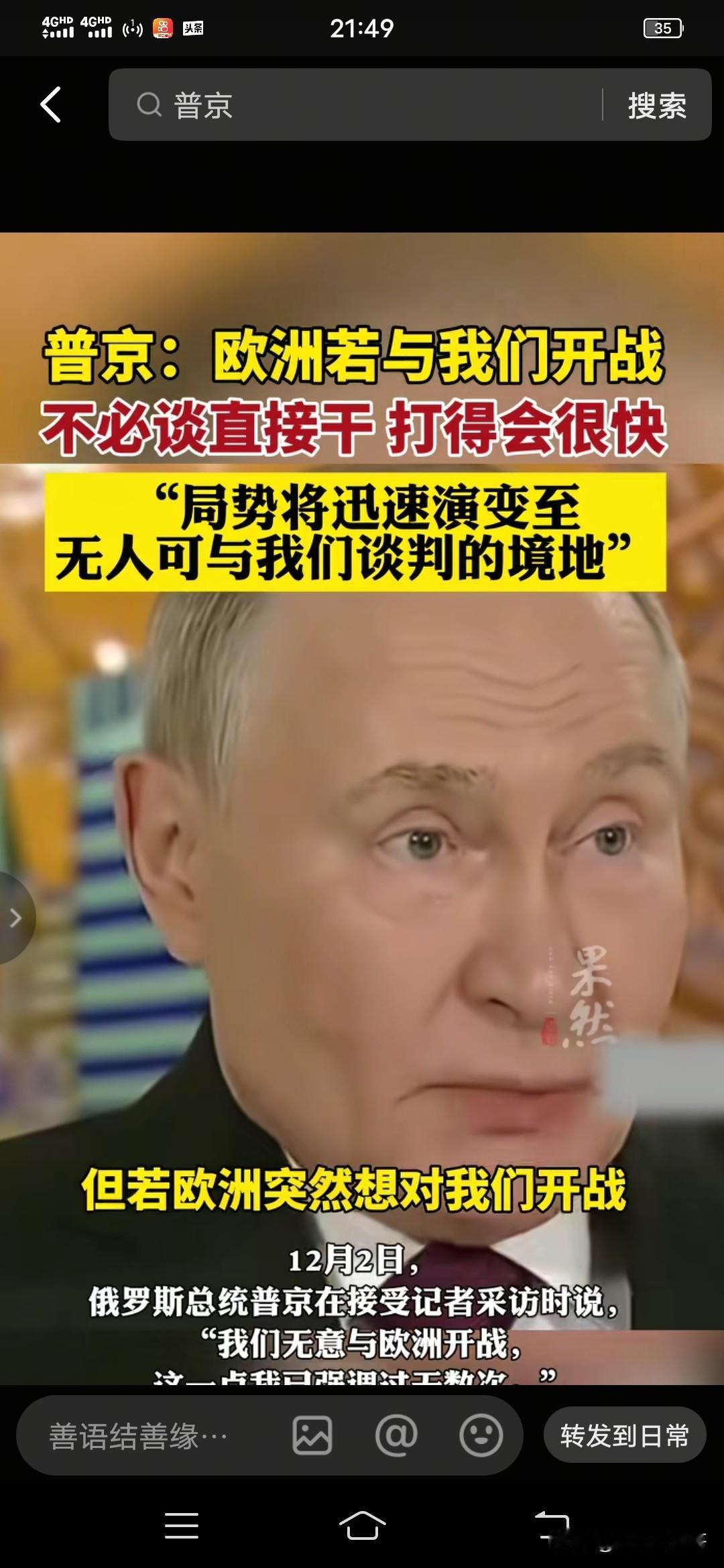 仅仅形容霸气哪里够,分明就是让对方连动手的念头都不敢有! 12月2日,普大帝接受记者采访时警告欧洲:如果欧洲想对俄罗斯突然开战,不用谈,可以直接开打,局势很快演变成无人跟我们谈的境地 ! 听听,敢跟我们打,后果就是无人跟我们谈 ! 没有国际交往的礼节客套,简单,直接, 通俗明白 : 你敢打, 很快就让你无人跟我们谈 ! 仅仅让你失败都不够,事情的严重性 ,而是让你灭亡 ,连投降的机会都没有 ! 普大帝这话可不是随意唬人吹牛的,俄罗斯做事可没有拖泥带水优柔寡断的性格, 决定的事,说干就干 ; 最重要的是有实力 , 俄罗斯拥有庞大的核弹头储备,根据2024年瑞典斯德哥尔摩国际和平研究所报告: 俄罗斯核弹头总数约4380m,其中1710m处于部署状态,2670枚为储存状态。陆基核力量以萨尔马特重型洲际导弹为核心,射程突破1.8万公里,可携带10枚重型核弹头, 速度达20马赫,突防能力极强,现有反导拦截系统拦截成功率低于15%。 有实力,敢说敢做,果断,这就是俄罗斯! 大国可以学一下!